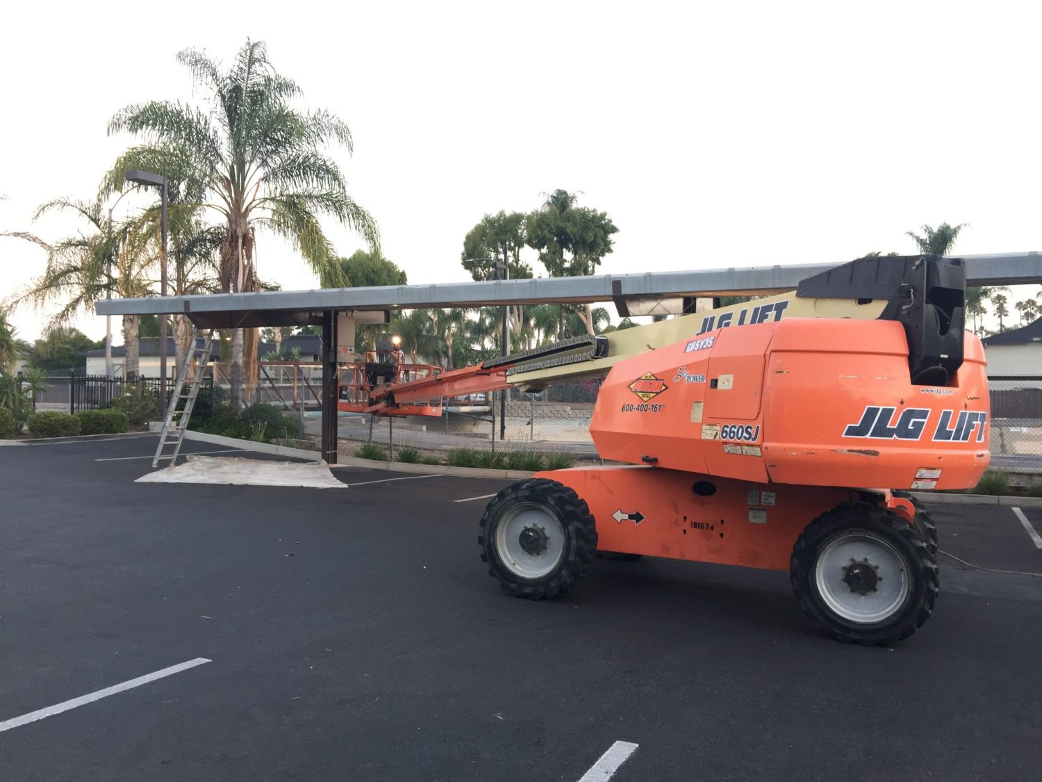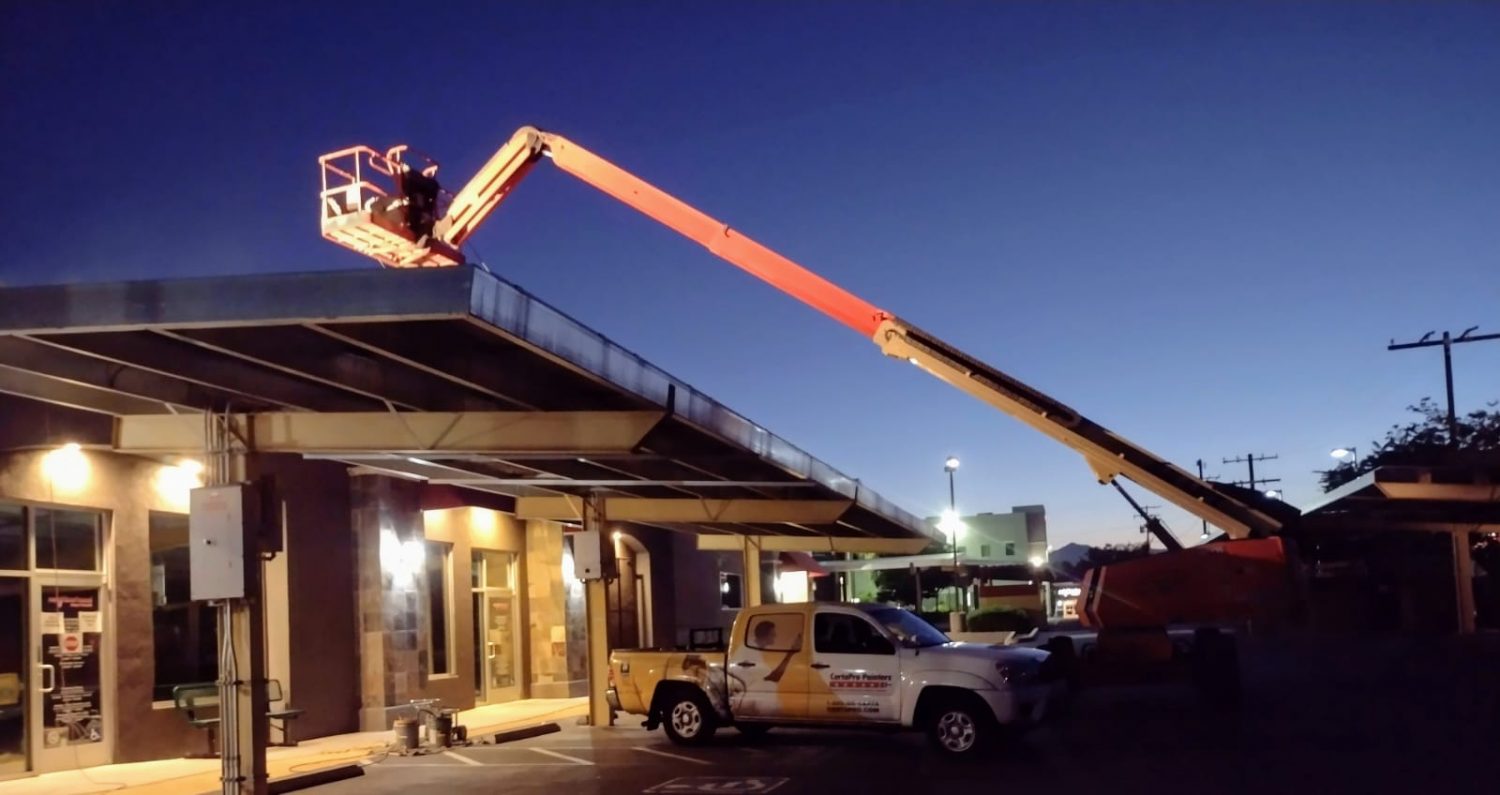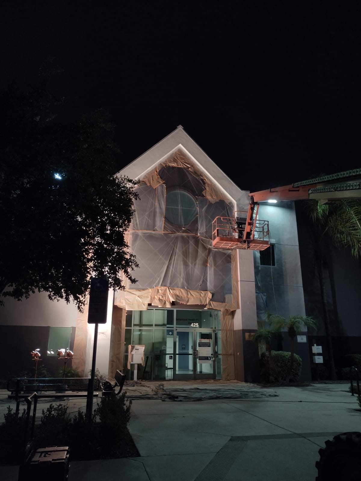 The challenge to this project was the Schedule & Routine. HOURS: Painting was to be done outside of business hours. No painting could be done while clients were present. This project was done all overnight. We had to deal with homeless people walking around, and it made it hard to send one of our team members to start on another building due to safety, we always needed to stay together. We also used a boom lift for the higher areas and big lights to see at night.