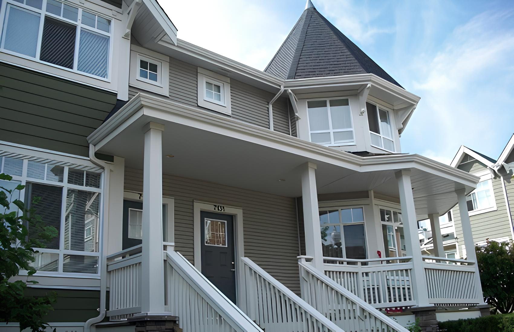 This Victorian style house looks great in traditional colours, allowing the wonderful architectural features to stand out on their own; the windows, pillars, porch railing, and tower.