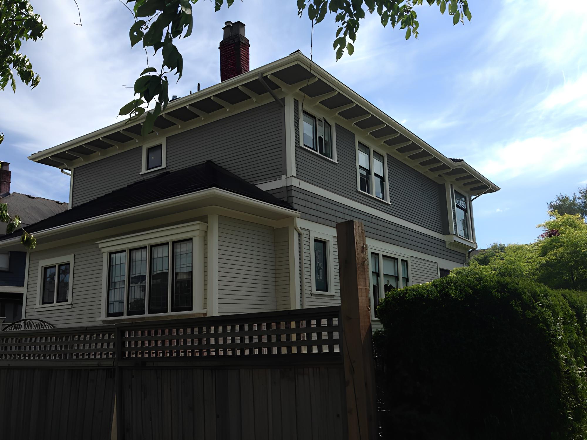 This two story house has a great look and feel with the use of a few colors to highlight an accent its great architectural features. Our premium paints help seal and protect both the tiles on the top half and wood siding on the bottom.
