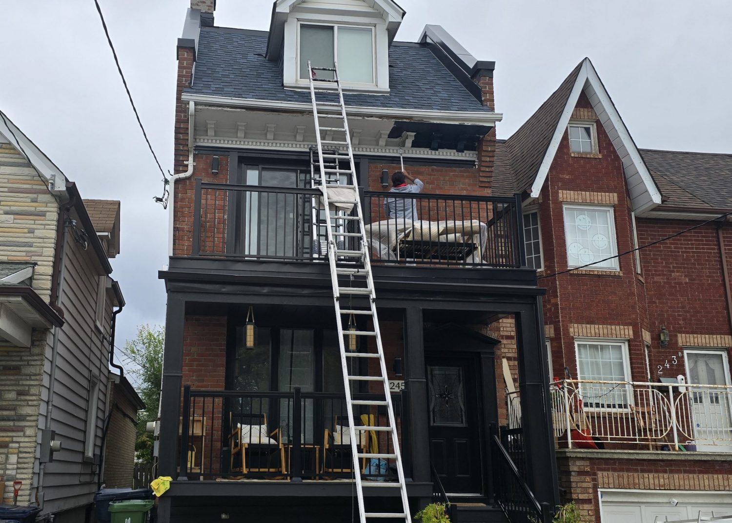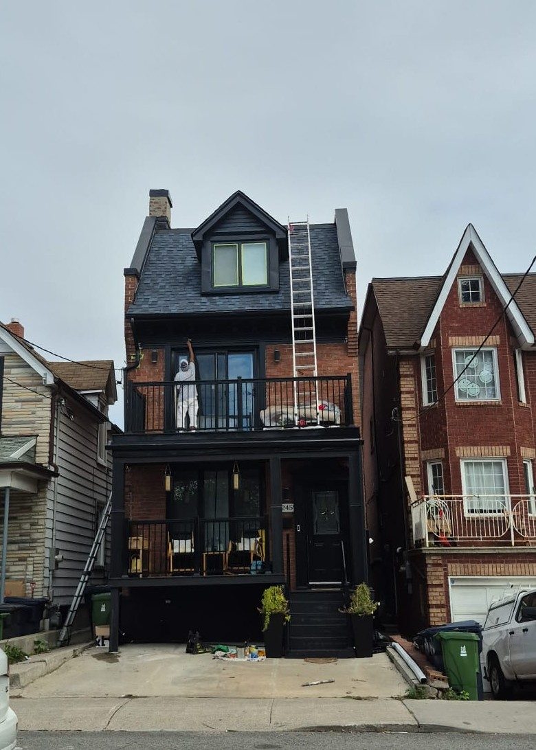 Due to the height and access constraints of the rear elevation, special attention was required for safe setup and precise application, particularly around detailed trim and upper dormer sections.