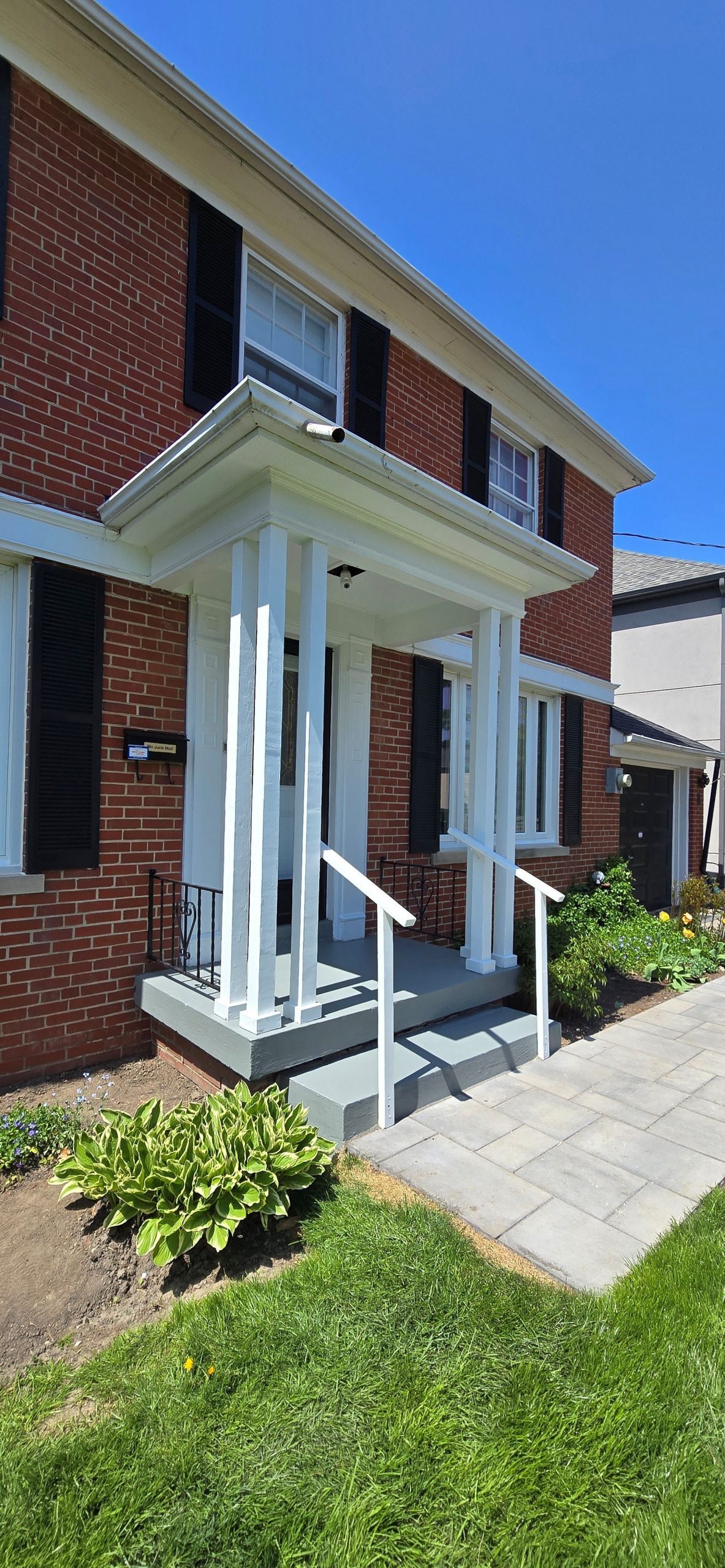 This exterior house painting project in Armour Heights, North York focused on restoring and protecting a detached home’s front entrance area. Visible wear—particularly on the porch floor, which lacked a proper protective coating—prompted a full maintenance repaint, including the porch, columns, front door, soffit ceiling, railing, and application of a durable porch floor coating. Thorough surface preparation, including patching, sanding, and caulking, ensured proper adhesion and long-term performance.
