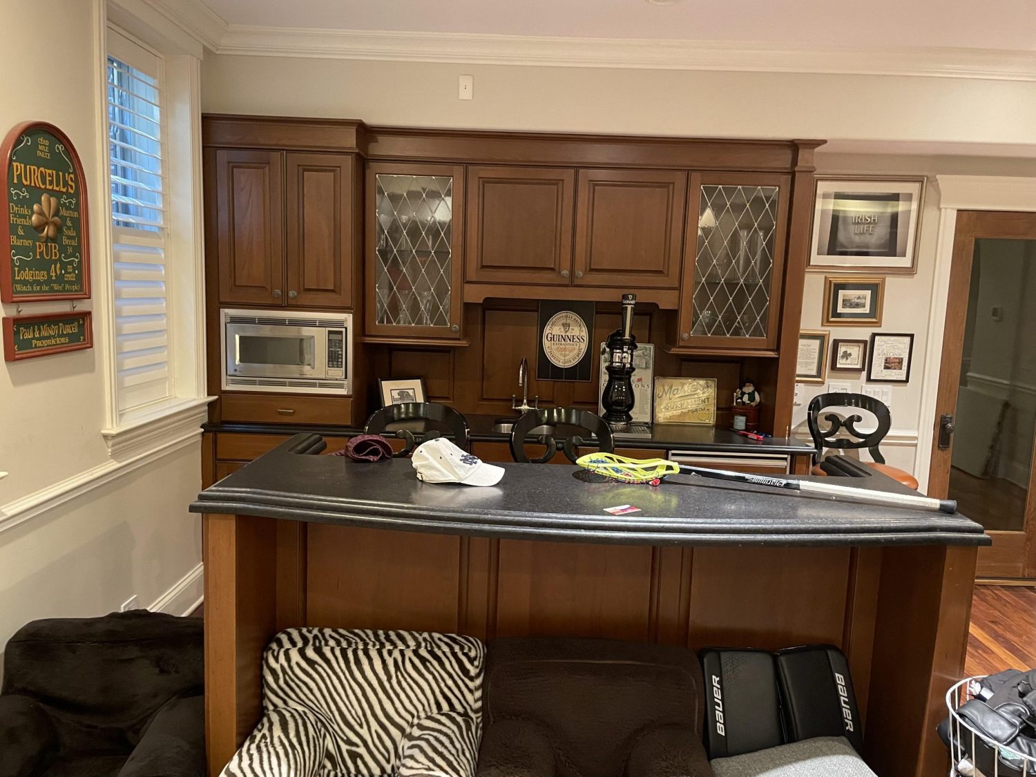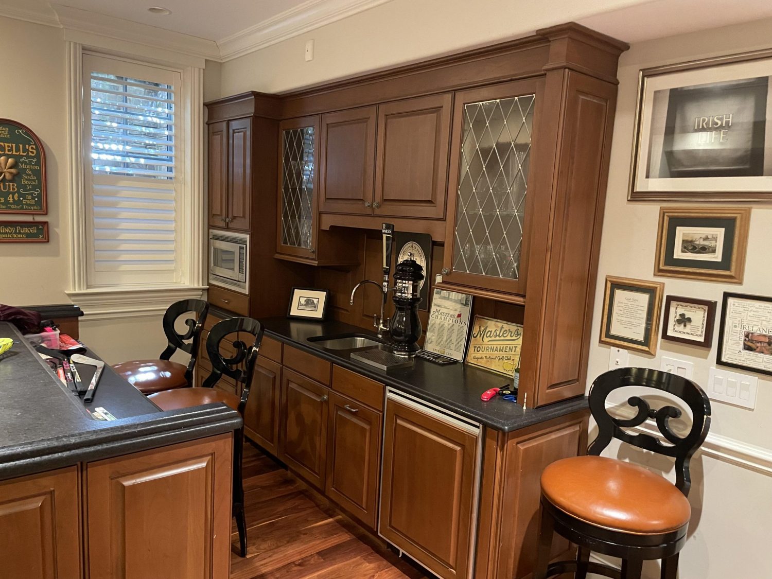 One of the primary challenges in this project was ensuring that the new gray paint on the cabinets would complement the black tabletop without overwhelming the space. The original brown stain had a classic appeal, but it clashed with the modern and sleek black surfaces in the kitchen. The homeowners desired a more integrated look to impress guests and add a refined touch to their kitchen space.