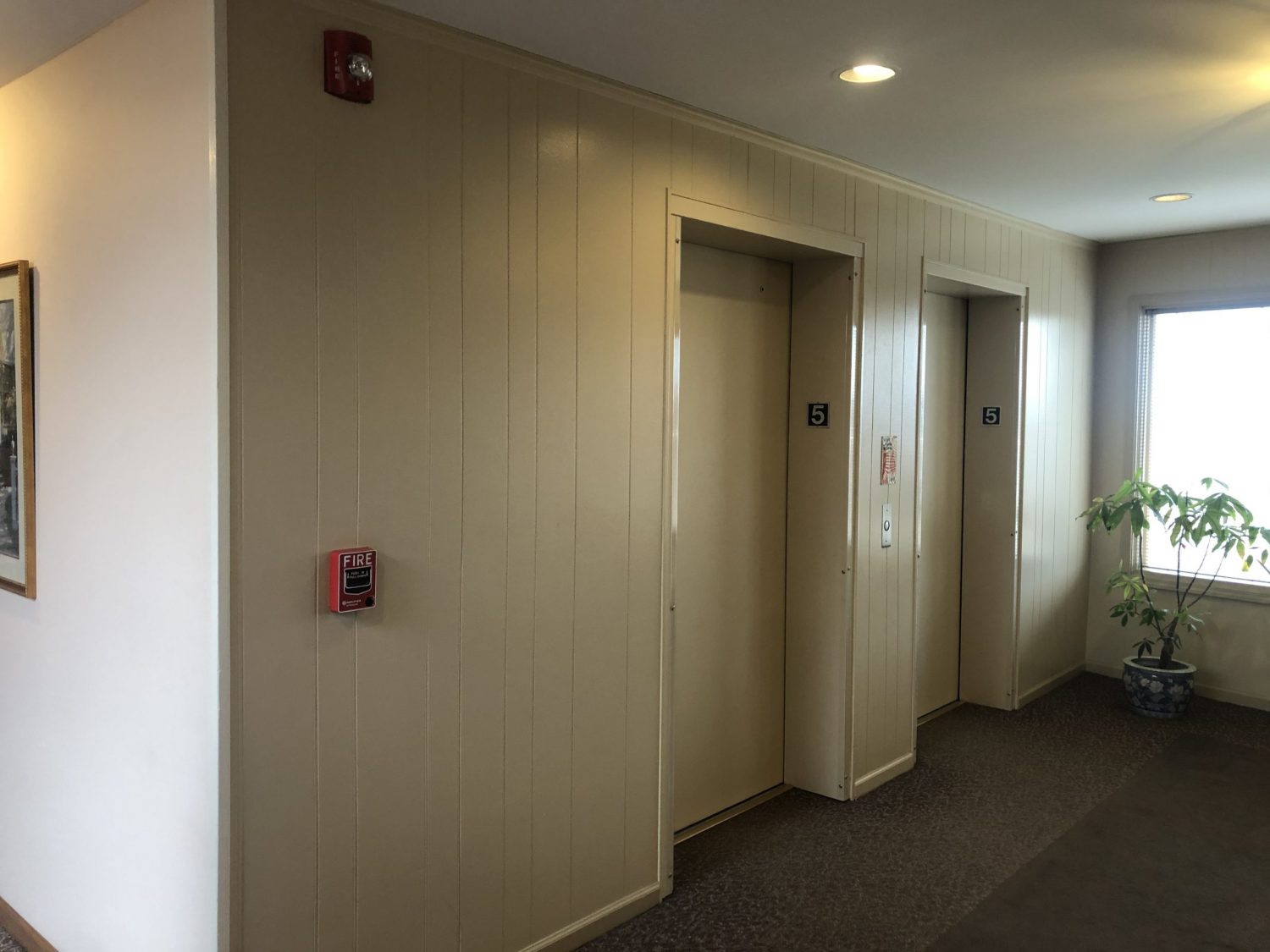 The walls in the building’s elevator vestibules were covered by wood veneer panels, an outdated look the building desperately wanted removed. Because the building’s budget did not permit the demolition, removal, and preparation of the existing panels,we provided them a solution of mudding and wallpapering the existing panels. This was a great solution because it masked the areas in question and kept the building under their desired budget number. This process involved using special glues and other wallpaper adhesives that were compatible with the existing veneer panels.