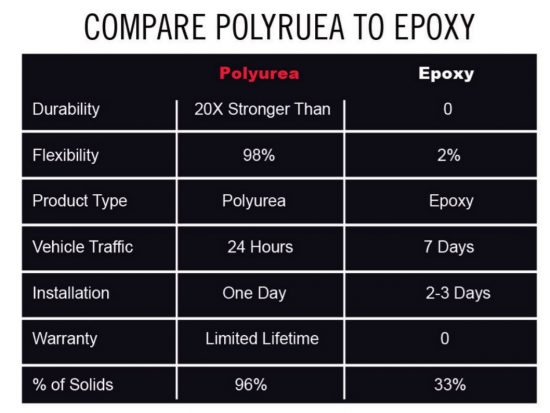 There are options when it comes to floor coatings, most commercial applications we recommend our customers to strongly consider Polyurea for its greater durability, quick cure time, and warranty. However, in residential applications like garage floors, sometimes epoxy is a more cost effective solution that will work for lighter residential use cases.