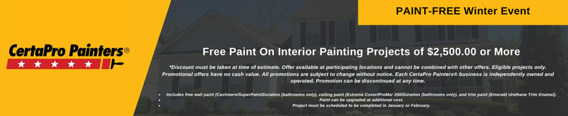 *Discount must be taken at time of estimate. Offer available at participating locations and cannot be combined with other offers. Eligible projects only. Promotional offers have no cash value. All promotions are subject to change without notice. Each CertaPro Painters® business is independently owned and operated. Promotion can be discontinued at any time. Includes free wall paint (Cashmere/SuperPaint/Duration (bathrooms only), ceiling paint (Extreme Cover/ProMar 200/Duration (bathrooms only), and trim paint (Emerald Urethane Trim Enamel). Paint can be upgraded at additional cost. Project must be scheduled to be completed in January or February.
