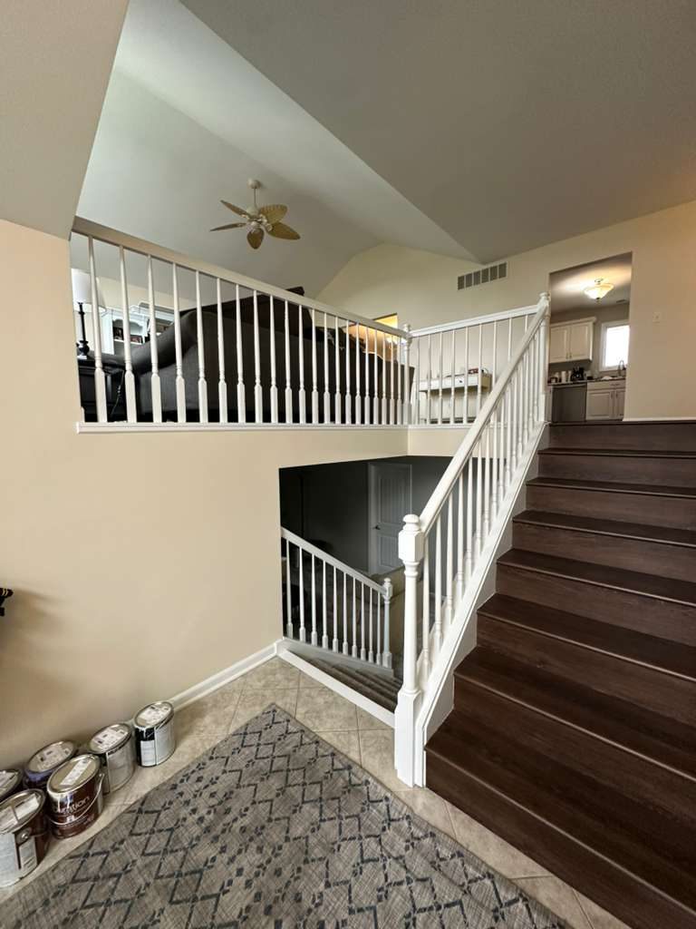 The scope of work included repainting all walls, ceilings, trim, door frames, and stair railings. Every surface required essential repairs before painting. Special care was taken to protect the newly installed flooring in each room. Old paint was also removed from the handrails and spindles to ensure a smooth, clean finish. The project team used a phased approach to complete the work efficiently while maintaining a clean, livable space for the residents.