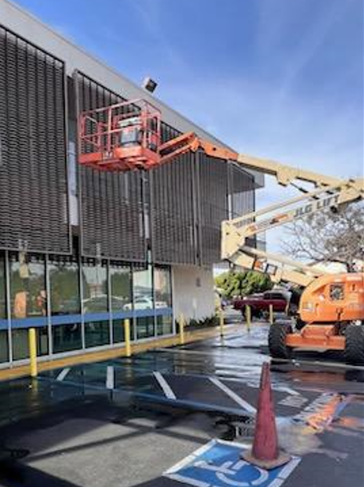 The project involved power washing, prepping, and painting the main body of the building, as well as additional elements like bollards, stucco/soffits, window mullions, staircases, and railings. One of the key challenges was accessing high areas, which required the use of a boom lift.