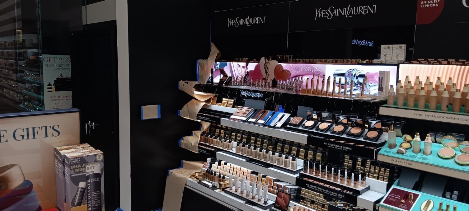 Sephora is a high traffic area that requires them to maintain their appearance without disrupting daily operations. Painters worked overnight shifts to accommodate store employees and business hours.
