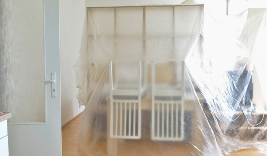 If it’s possible, remove all the furniture in the room. It will save you more time than you know trying to work around it. If it’s not possible, move it all to the center of the room and cover it with a plastic drop cloth. Make sure it’s secured with tape to protect it from rogue splatters or drips.