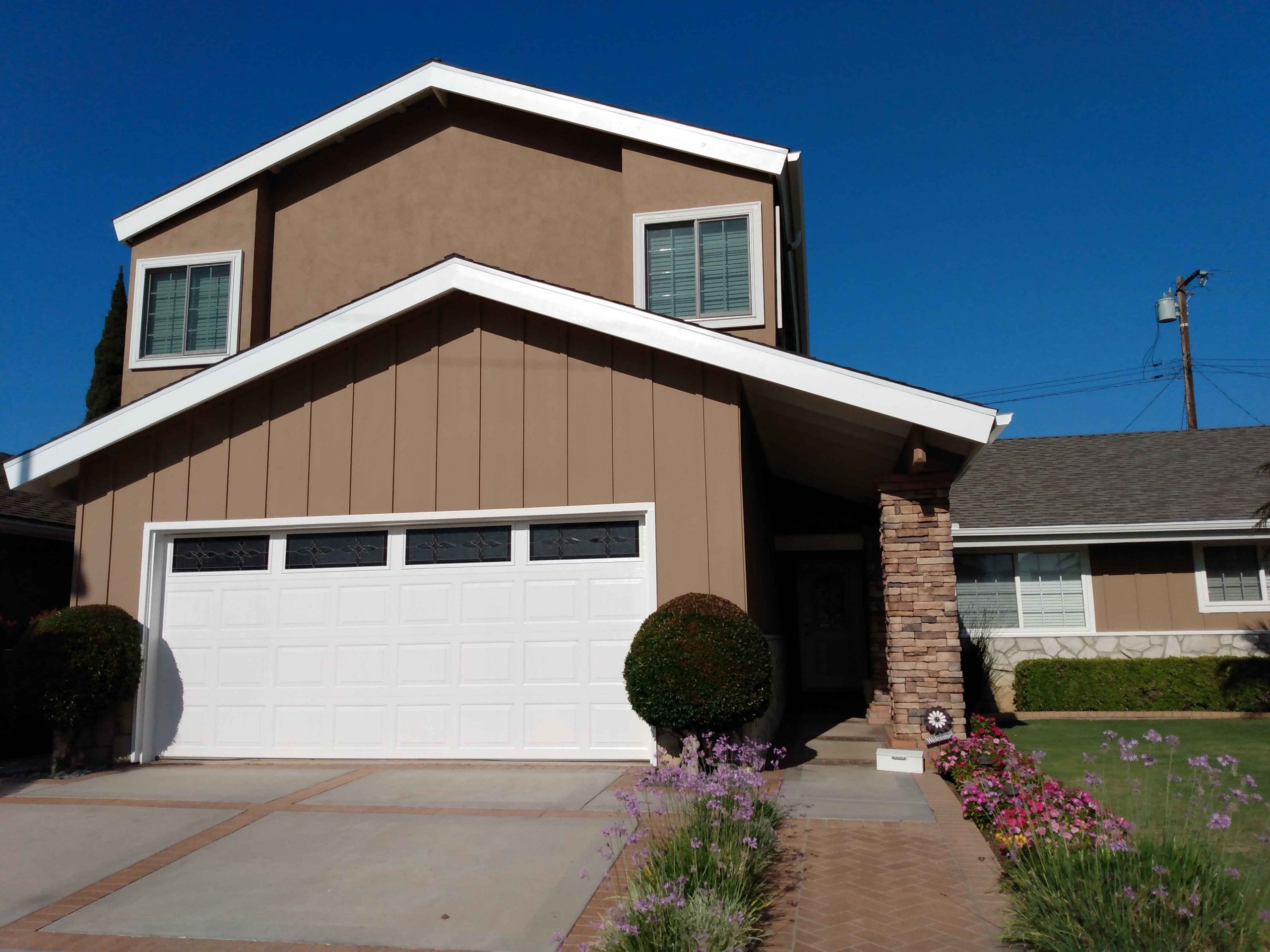 COLORS:Siding and Stucco: Dunn Edwards, Mesa Tan (DEC718)Eaves, Trim and Door: Dunn Edwards, Whisper (DEW340)