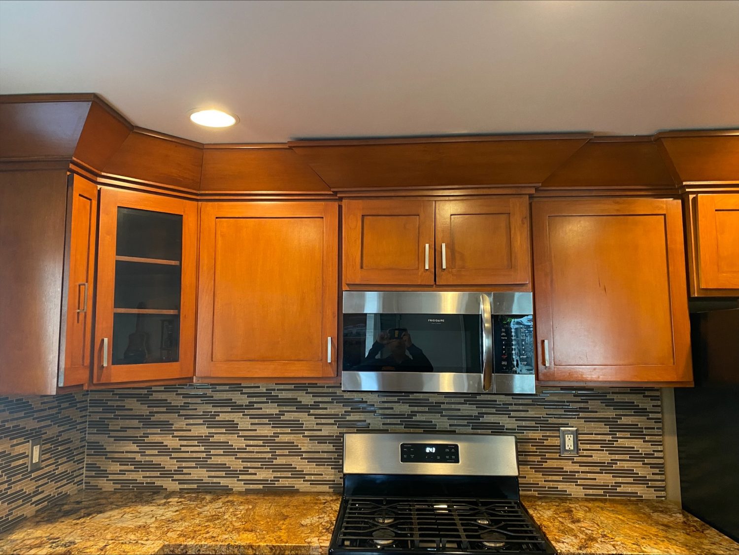 Original stained cabinets were in varying condition. Overall, the kitchen was in good shape and just needed proper prep work and painting to bring new life to the area.