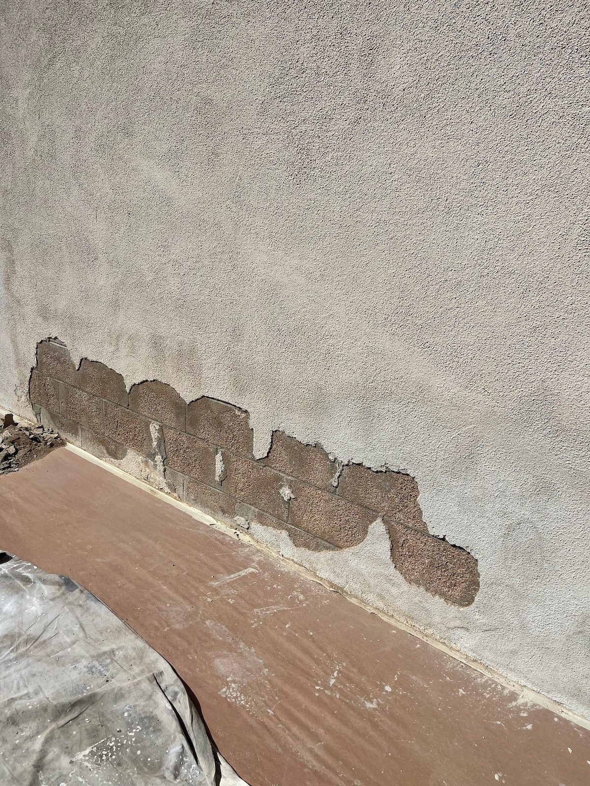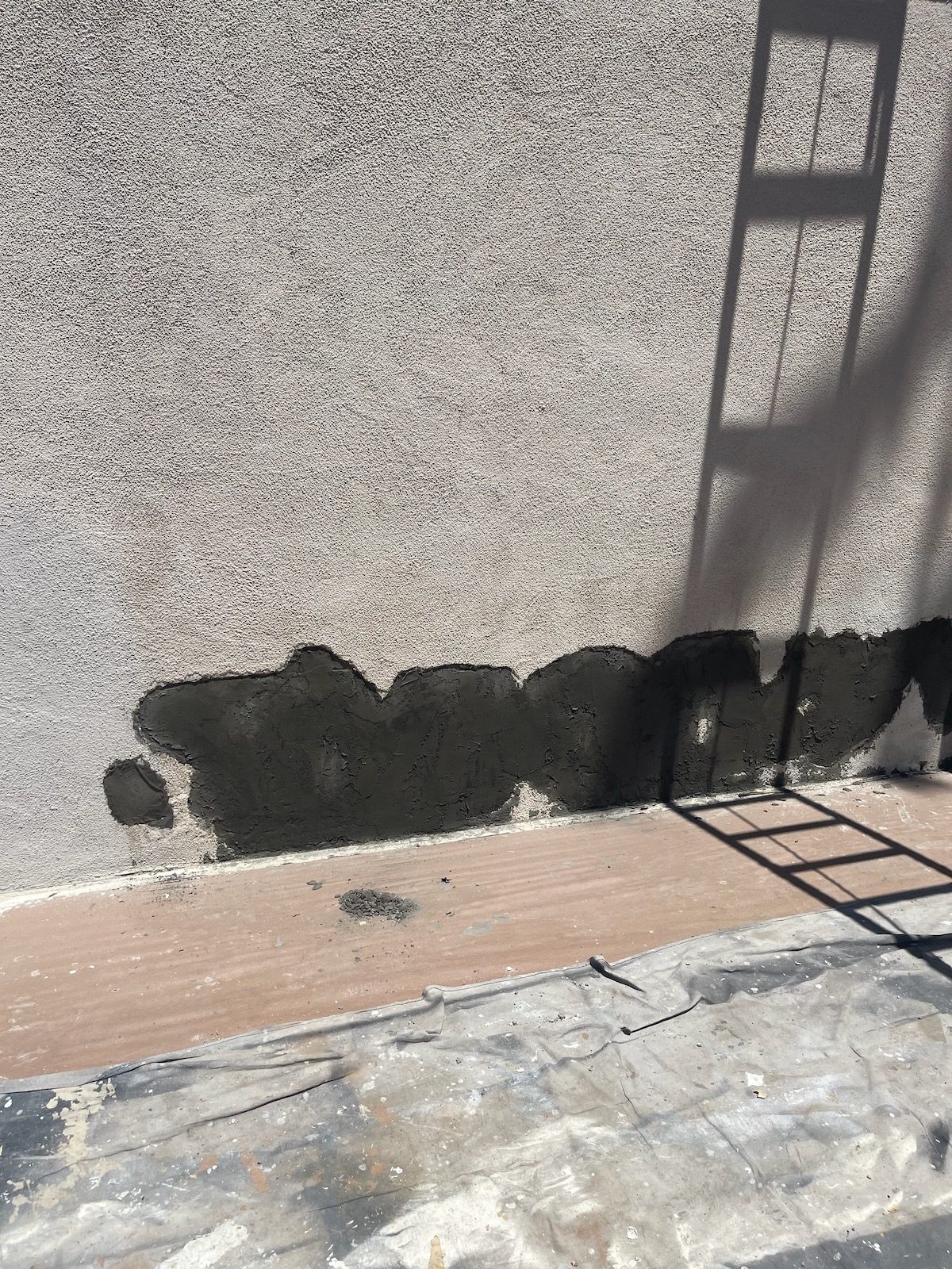 The bare brick underneath was coated in concrete and concrete binding adhesive to provide a firm surface for the new stucco. Once the concrete dried new stucco was applied and finished by texture matching it to the original finish to ensure a flawless and consistent look. Once the stucco dried it was primed for painting.