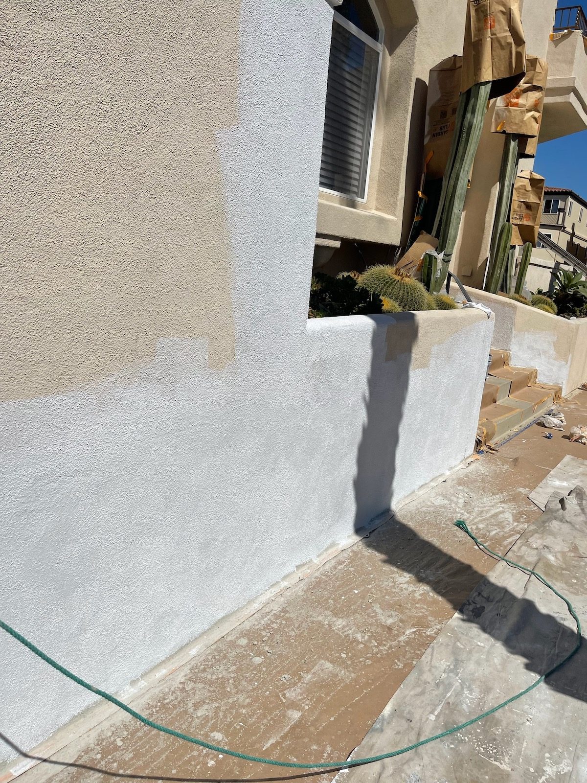 When CertaPro Painters of Orange County was chosen to perform a full exterior paint job on this home they had to first deal with a number of areas of heavily damaged stucco. Over time the stucco had begun to crack and flake off of the underlying brick along the exterior and retaining wall surrounding the home. With the stucco in terrible condition, the first step was to perform repair work as part of the overall prep normally conducted on a stucco home before repainting.