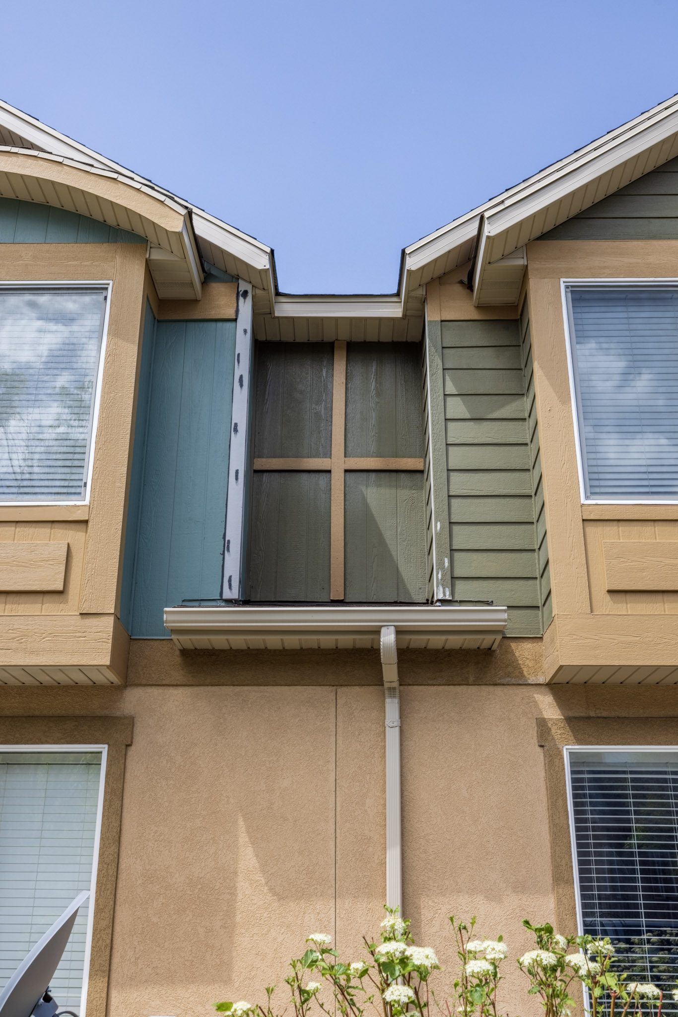 There was some peeling paint but the larger problem was the significant fading to the red, green, and blue portions of the exterior. Deeper hues or colors with more saturation tend to fade at a faster rate. We also requested that repairs be made to certain areas of the Hardie board sections before we painted. We power washed all areas to be painted, caulked areas where previous caulk was failing, then scraped any peeling paint. For the wrought iron railings we scraped and/or sanded and/or ground any rust areas and spot primed. We then applied two finish coats of paint to all designated areas.