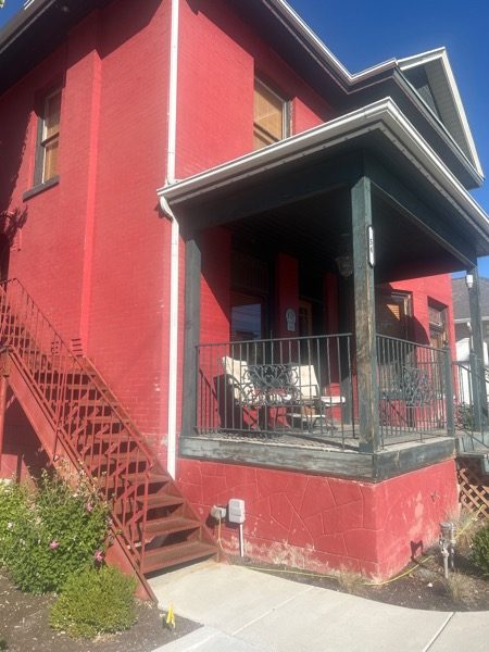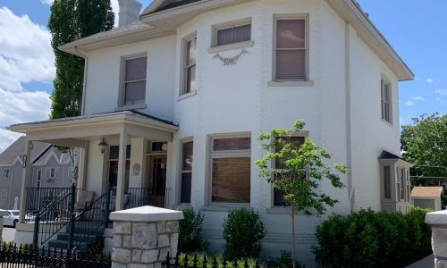 The week-long project involved a full exterior repaint of the home, which had previously accumulated many layers of coatings over its long history. Given the building’s age, surfaces were far from perfect and required careful preparation. The crew began by protecting the surrounding landscaping and walkways with plastic sheeting and performed a full power wash of the exterior, following lead-safe practices throughout the process.