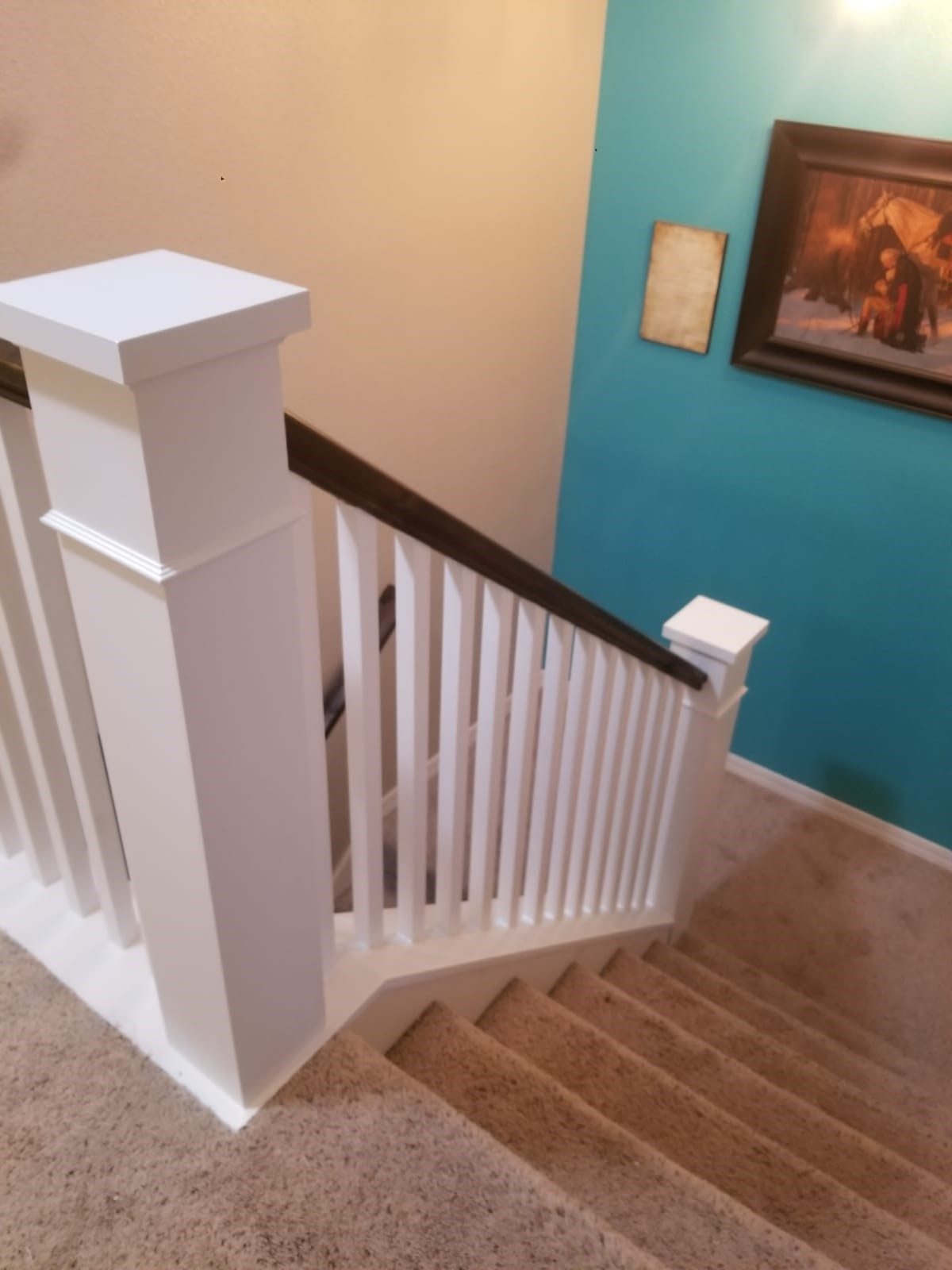 Residential Staircase refresh. The progress photos show the preparation taken to protect surrounding areas and the sanding needed. The final pictures show the 2 tone completed project.