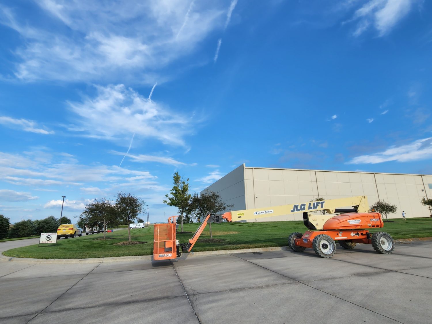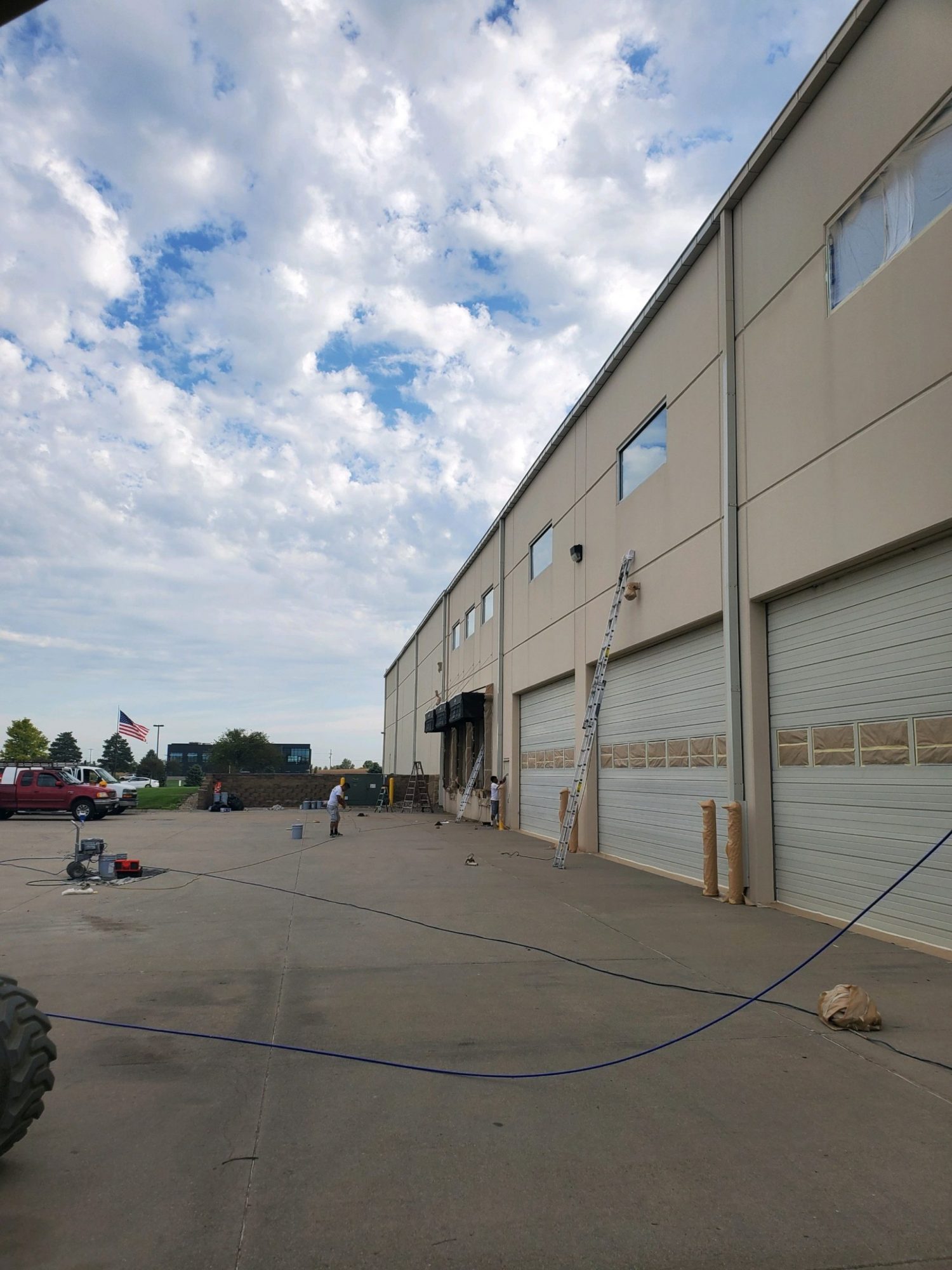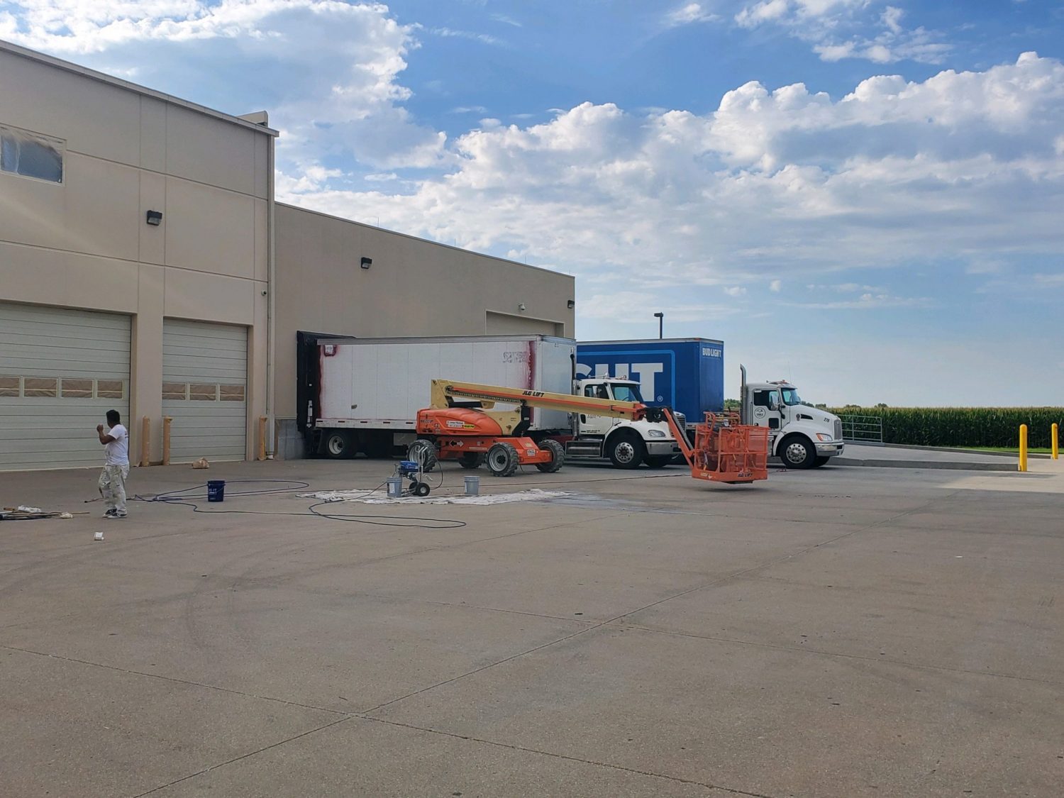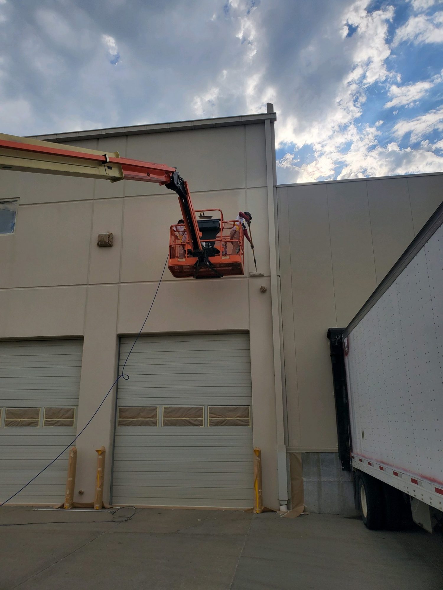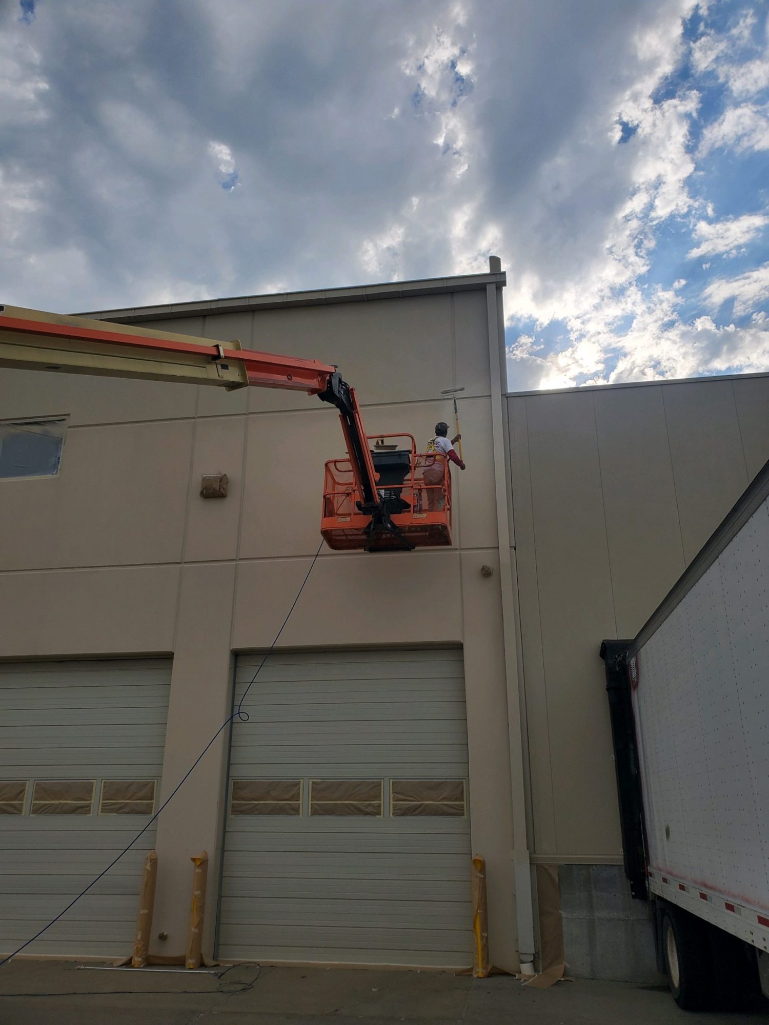 To complete the project, our crew of painters had to use a boom lift to access the upper areas of the building. When painting, we had to work around moving trucks in the distribution center which was challenging.