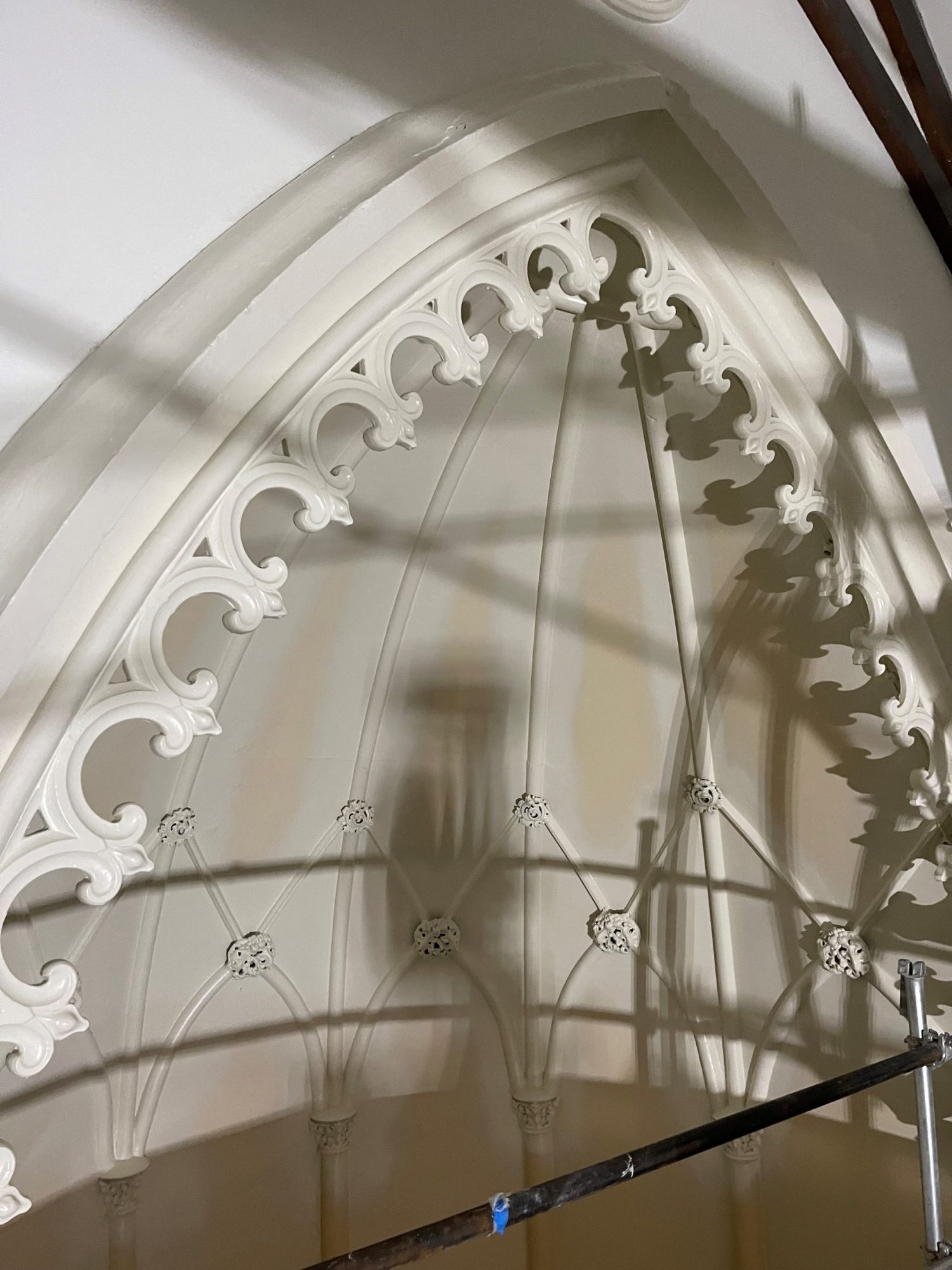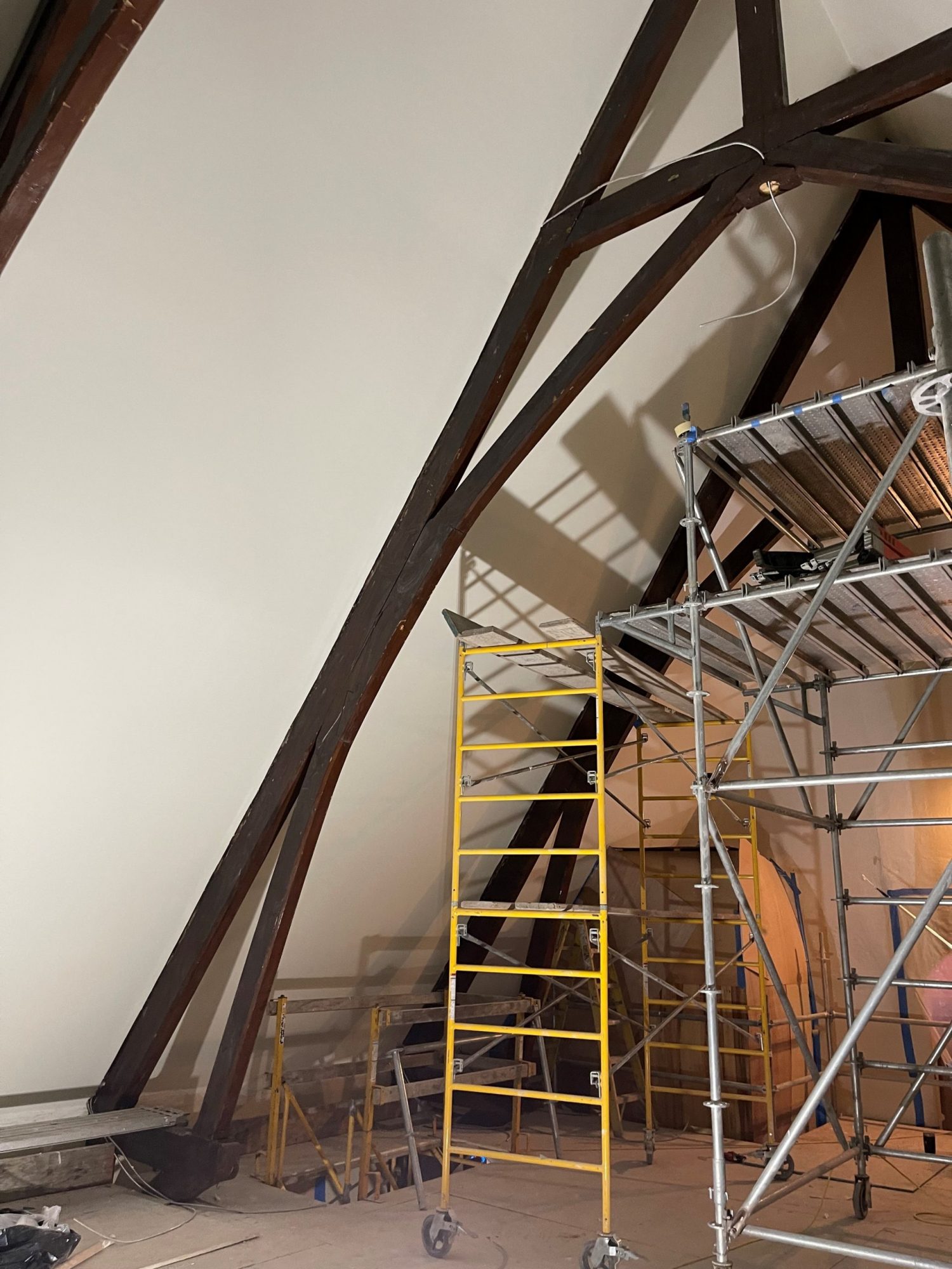 The project took two weeks for the set-up of multi-level scaffolding and removal of 3000 sq ft. of old plaster which was hand-carried down the scaffolding. This included the setup of systems scaffold to create a stable platform and pipe scaffolds on platform to access the ceiling. Workers also were required to don forced air ventilating respirator systems during the removal of the plaster due to excessive dust & debris which had accumulated this over a century. We then spent two weeks carrying out carpentry and sheet rocking replacing the old plaster and lathe with sheet rock. The final two weeks of the project were spent on painting and finishing.