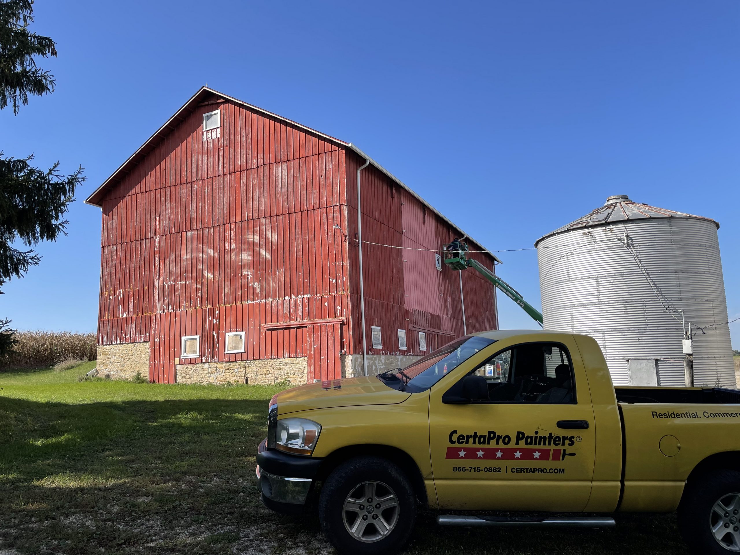 Barn painting project in Sugar Grove, Illinois. We applied Benjamin-Moore Ultra Spec in customer color of customer’s choice, after prepping the barn’s exterior and spot priming. To expedite the project, we utilized a boom lift from Sunbelt Rentals (also located in Sugar Grove) and a Mustang All Pro sprayer.