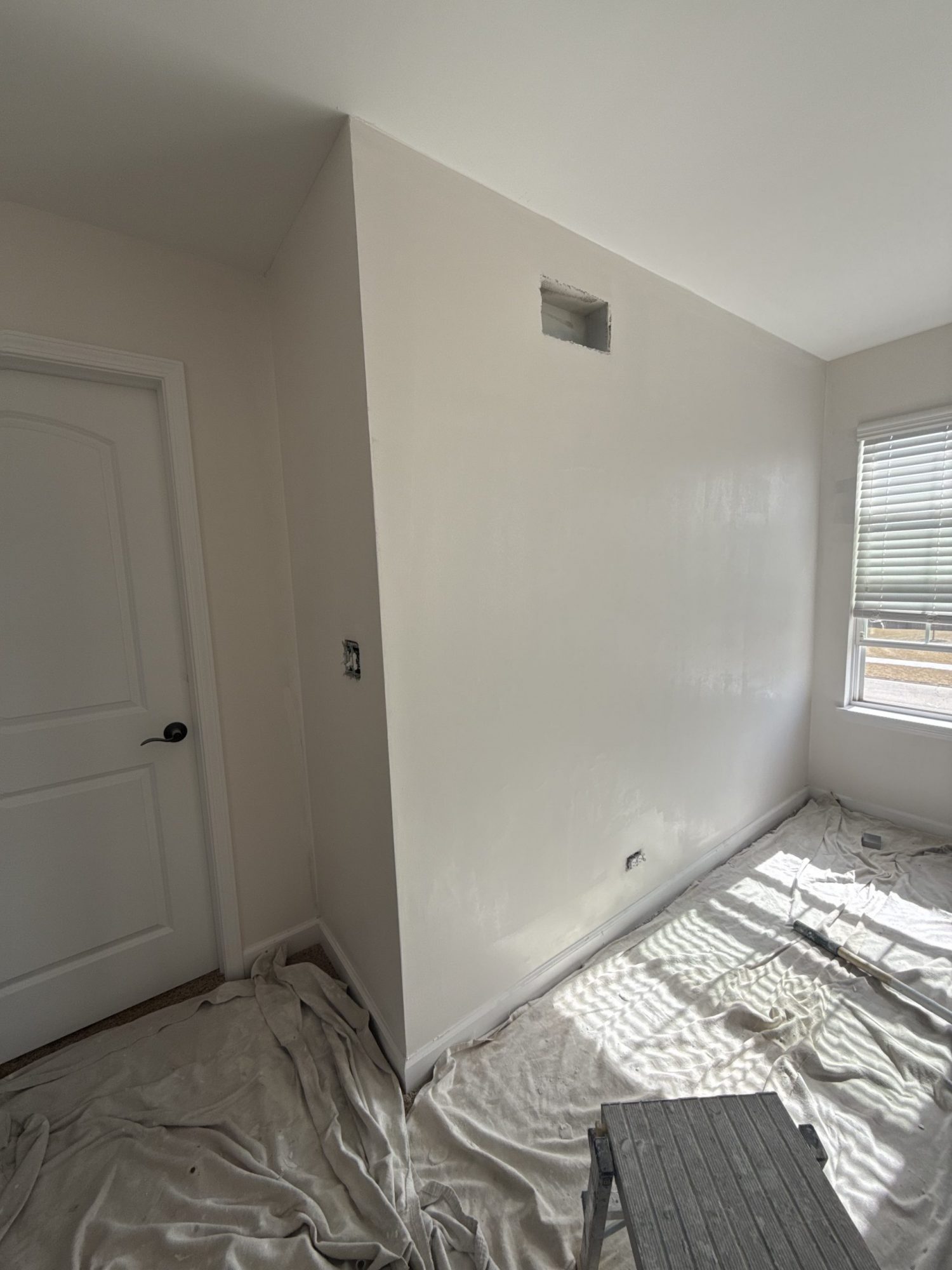 After removing the shiplap, our crew carefully sanded the affected wall to create a uniform surface. To properly treat the exposed gypsum, we applied Zinsser® Gardz® Problem Surface Sealer, a water-based solution designed to seal compromised drywall. Once sealed, we skim-coated the wall with plaster to rebuild a smooth finish. After sanding and final surface preparation, the wall was primed and top coated using Sherwin-Williams Cashmere paint in an eggshell sheen, delivering a durable and elegant final appearance.