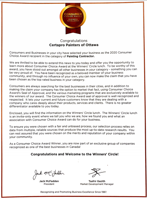 We are thrilled to have been selected for the 2020 Consumer Choice Award for Business Excellence. We strive to provide excellent customer service to all of our customers in addition to exceptional painting results. See the letter we received below.