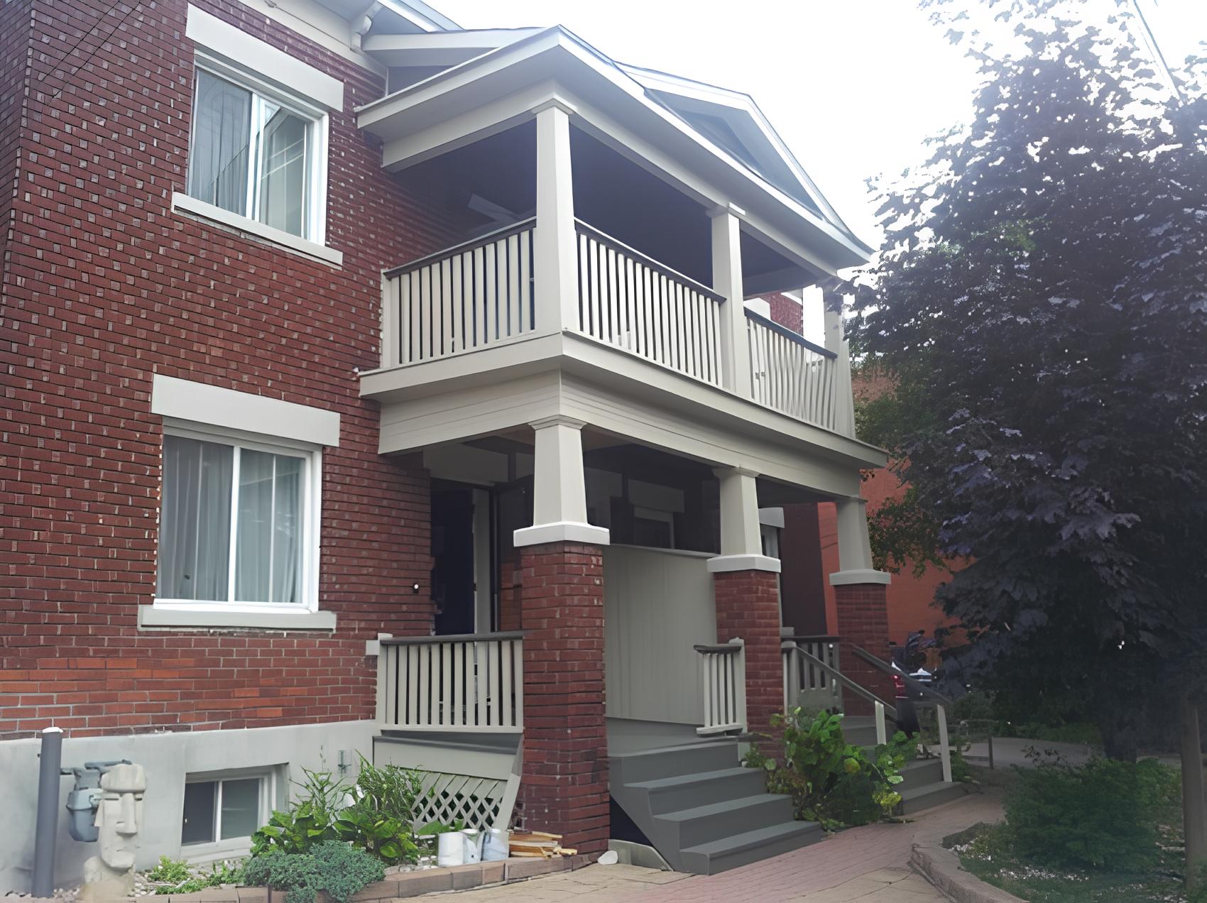 This multistory home in Island Park, also known as Wellington Village, required repainting and minor repairs. The trim work and porch rails on this house in Island Park received a fresh coat of paint, bringing the contrast between the red brickwork and the white trim to a sharp focus. This highlights the architectural features of this home, such as the pillars and beautiful balcony.