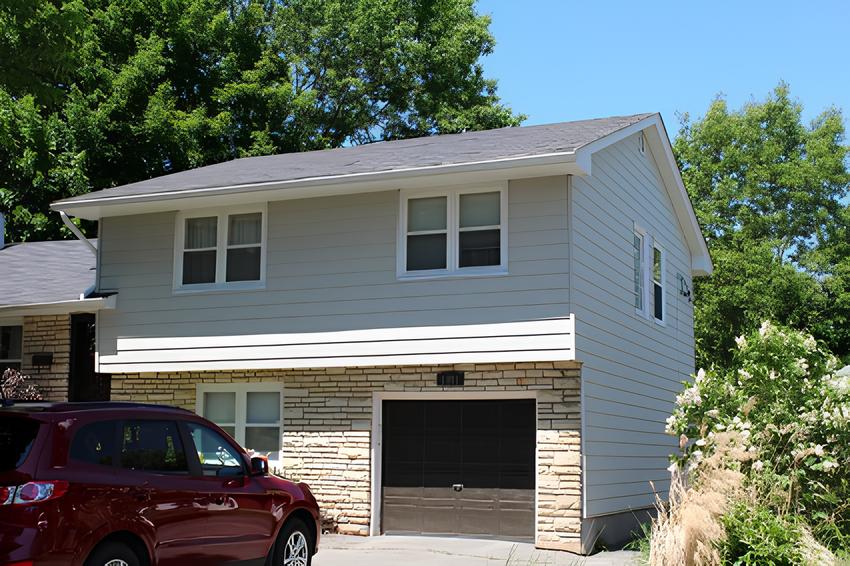 The minimalist flair of this colour scheme allows the siding to blend in with the masonry work, while accentuating the two main entryways; the front door and the garage.