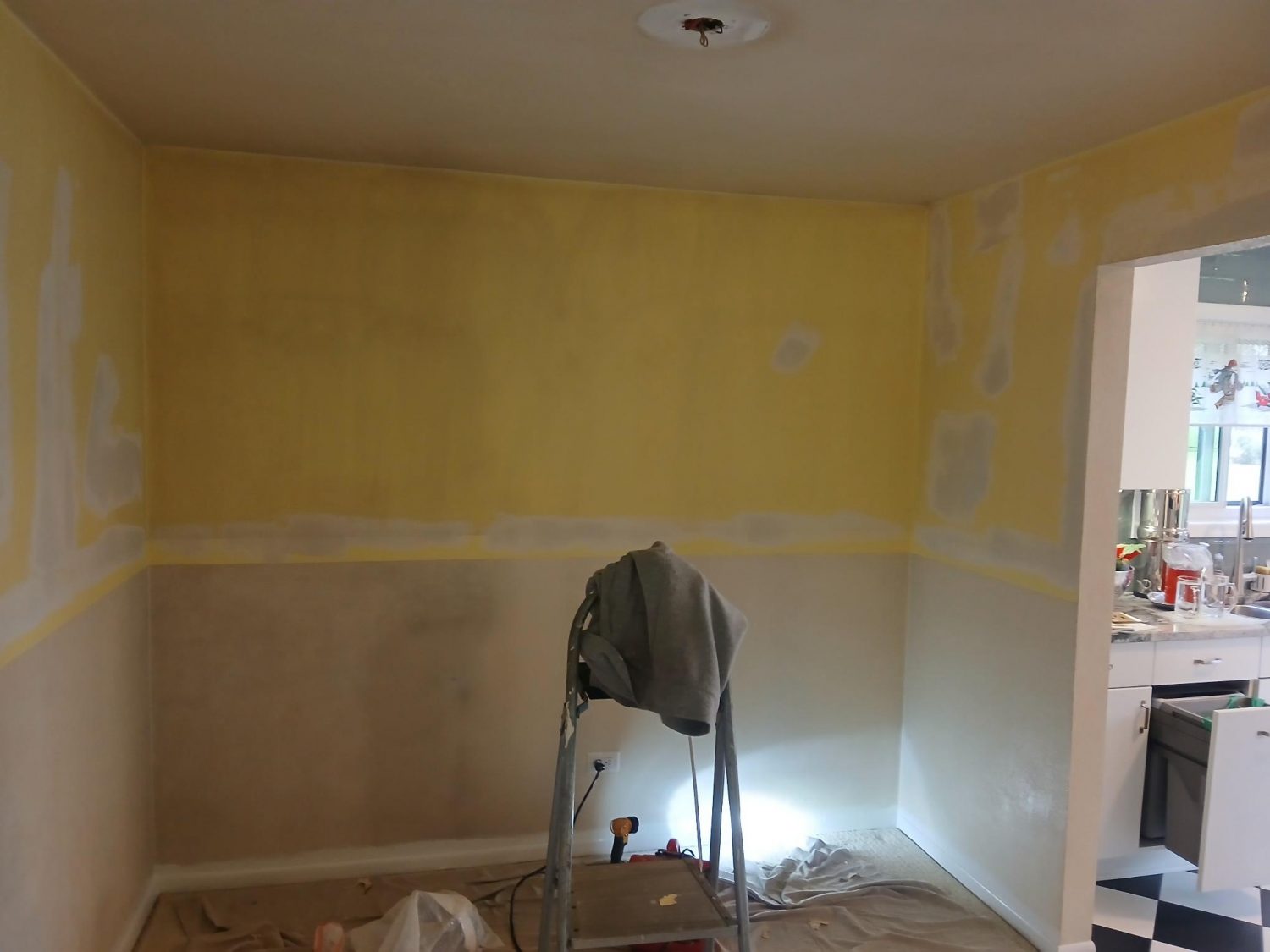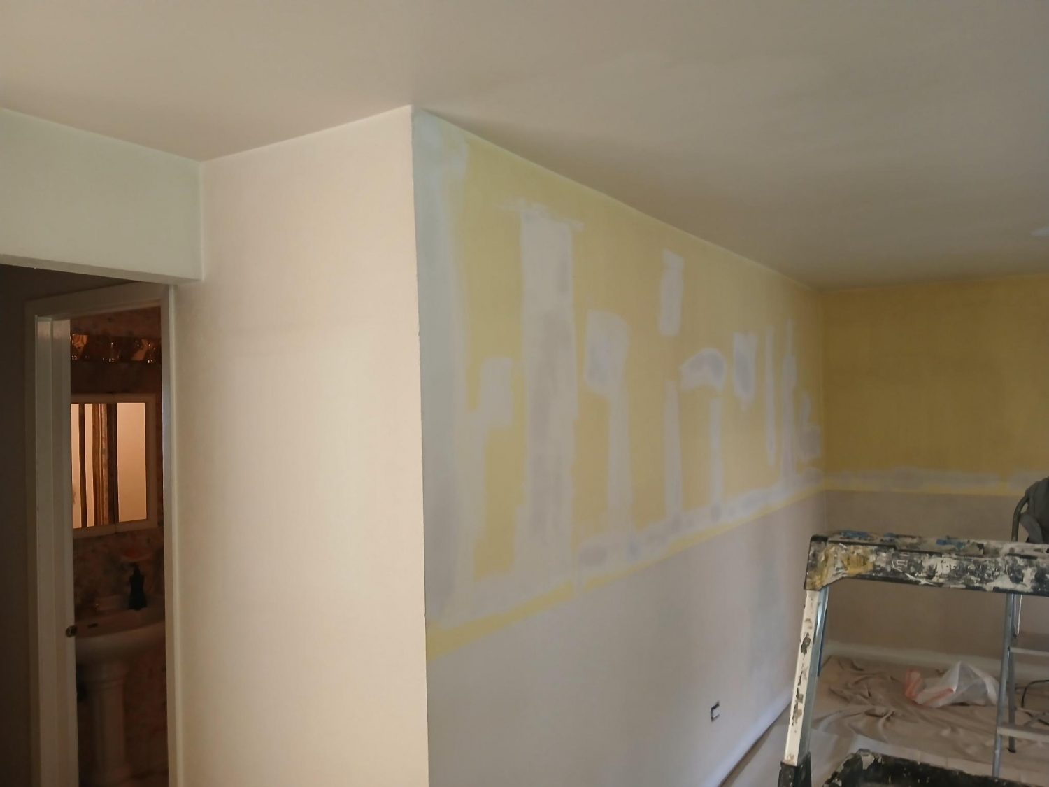 The crew performed a full interior prep and repaint, beginning with filling minor cracks, nail pops, and small holes in both the walls and ceilings. Additional prep included removing a wallpaper border, repairing corner beads, and completing a roughly 3×5 inch drywall patch.