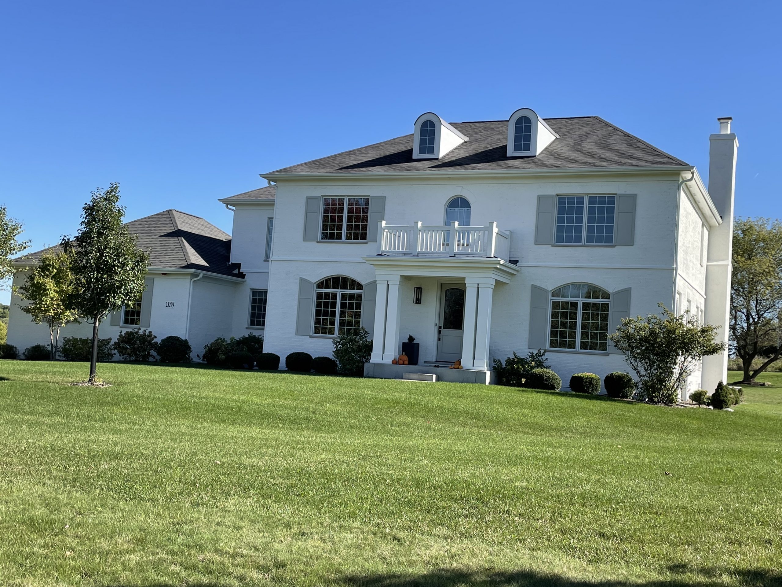 With today’s specialty paints, painting a brick house today is no harder than painting a wood house. This home looks great painted in the shade of “White Dove” by masonry and brick paint supplier Roma Bio. The shutters are done in a contrasting shade called “Revere Pewter” to complete the look.