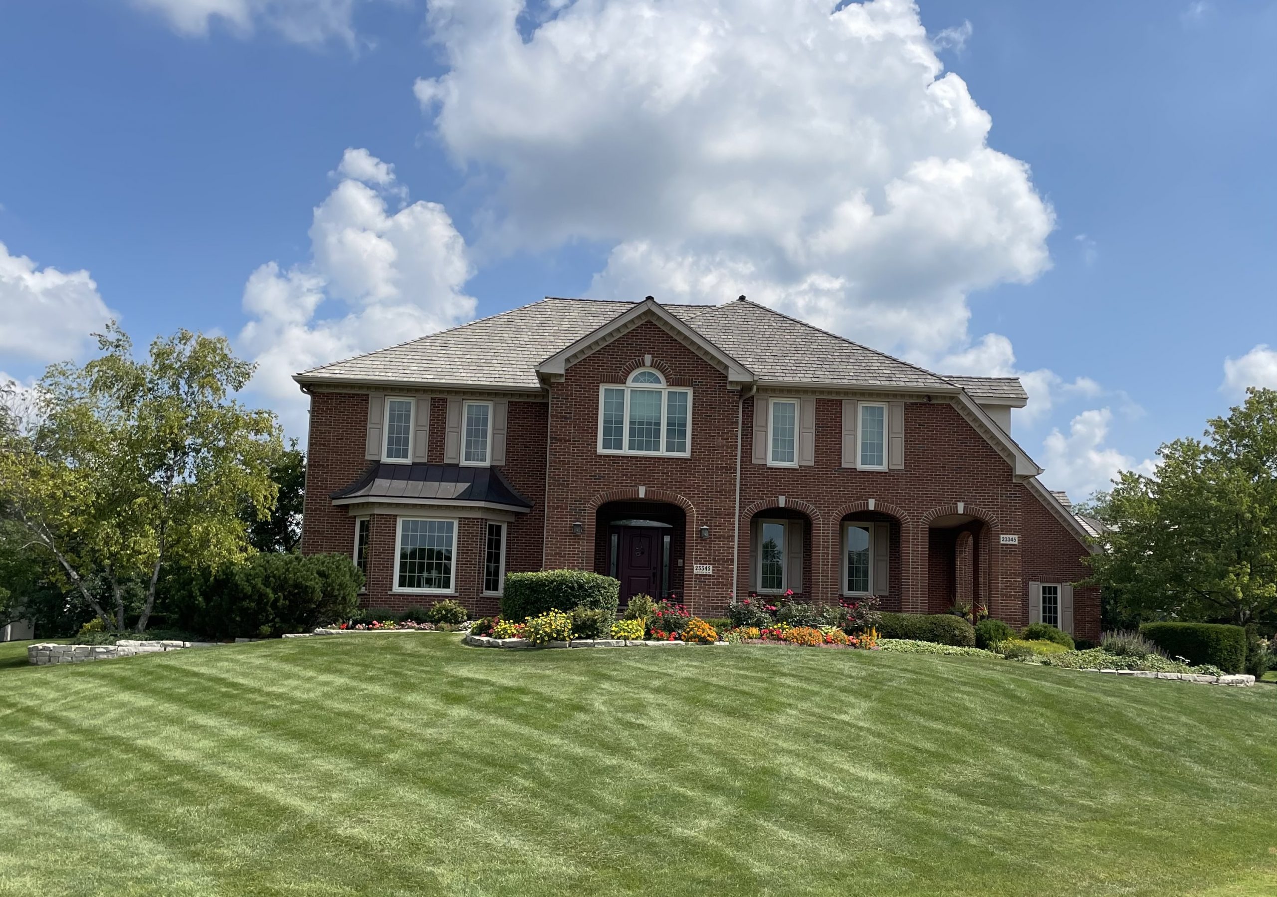 This brick home received a bit of personalization with light tan trim and shutters.