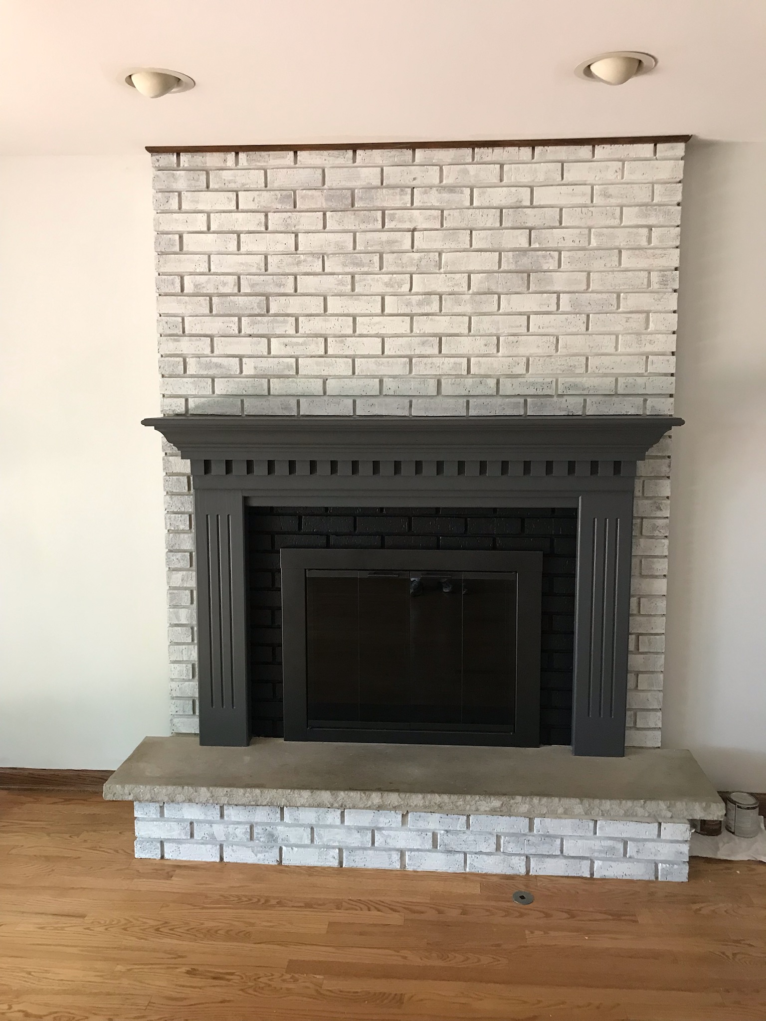 Brick fireplace heavily white washed.