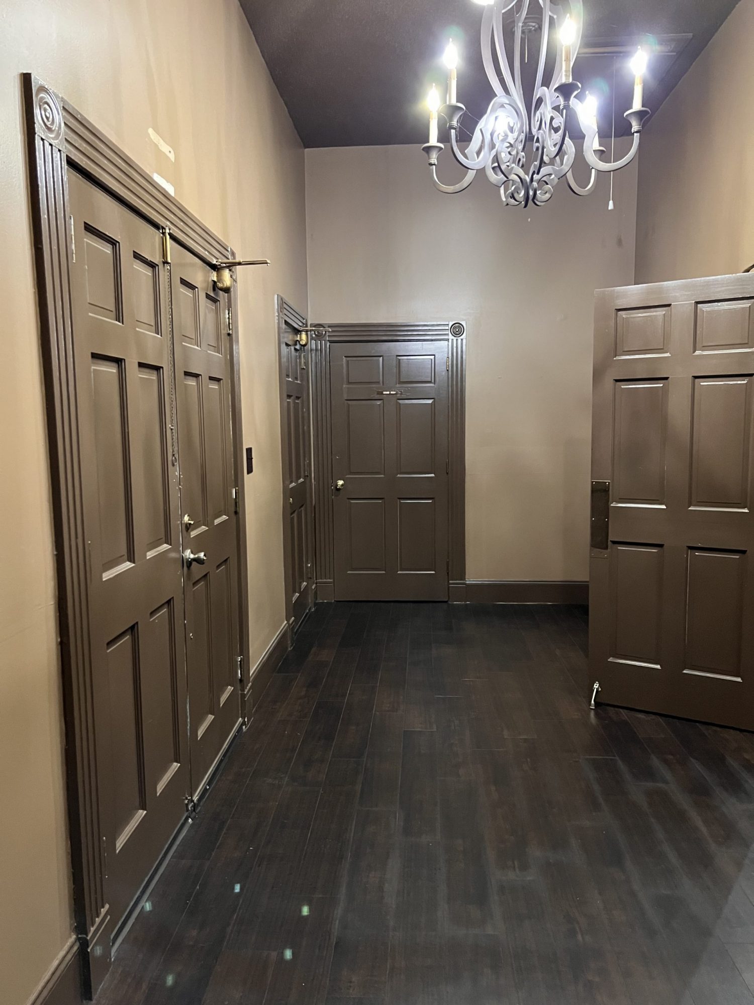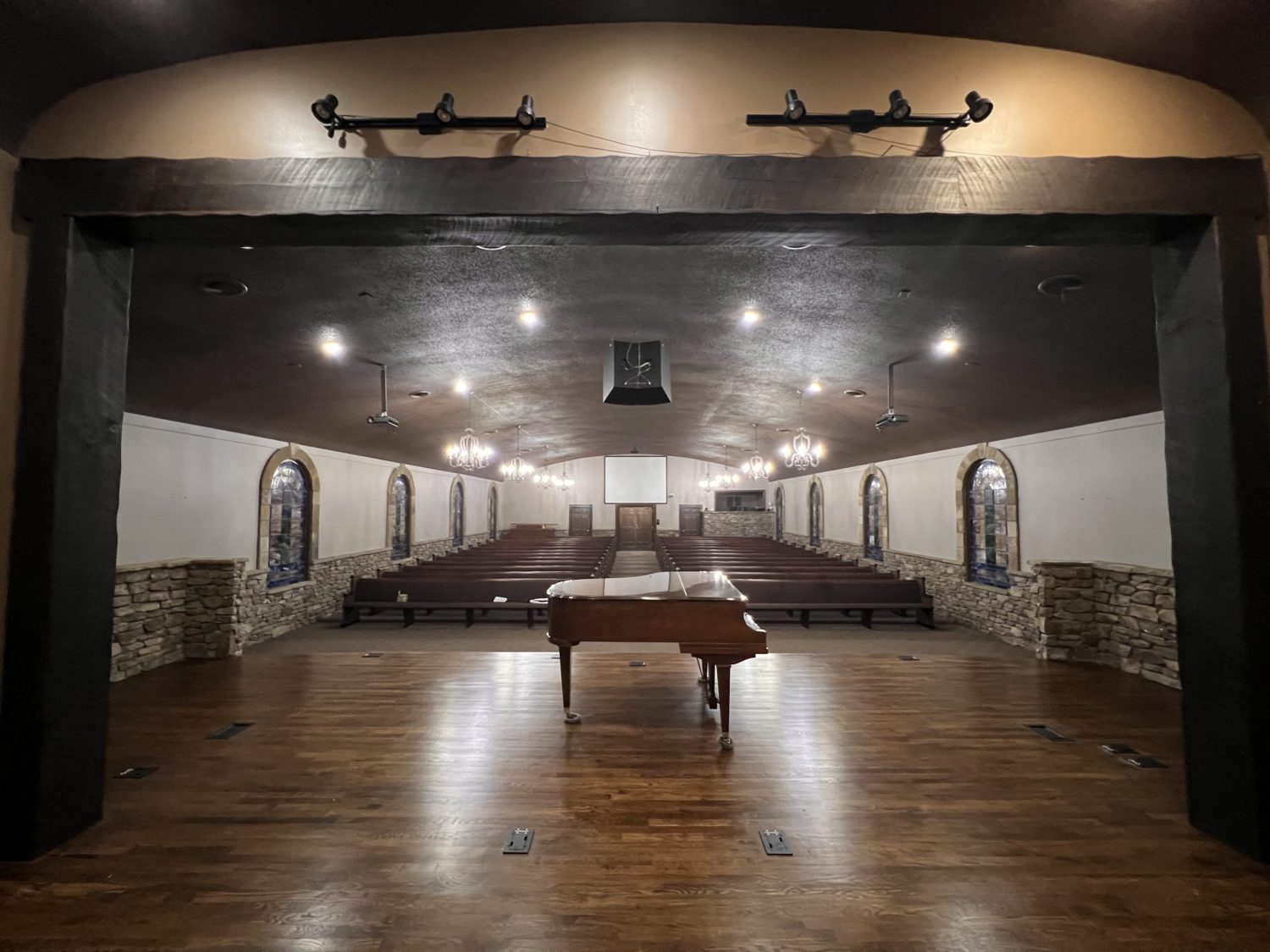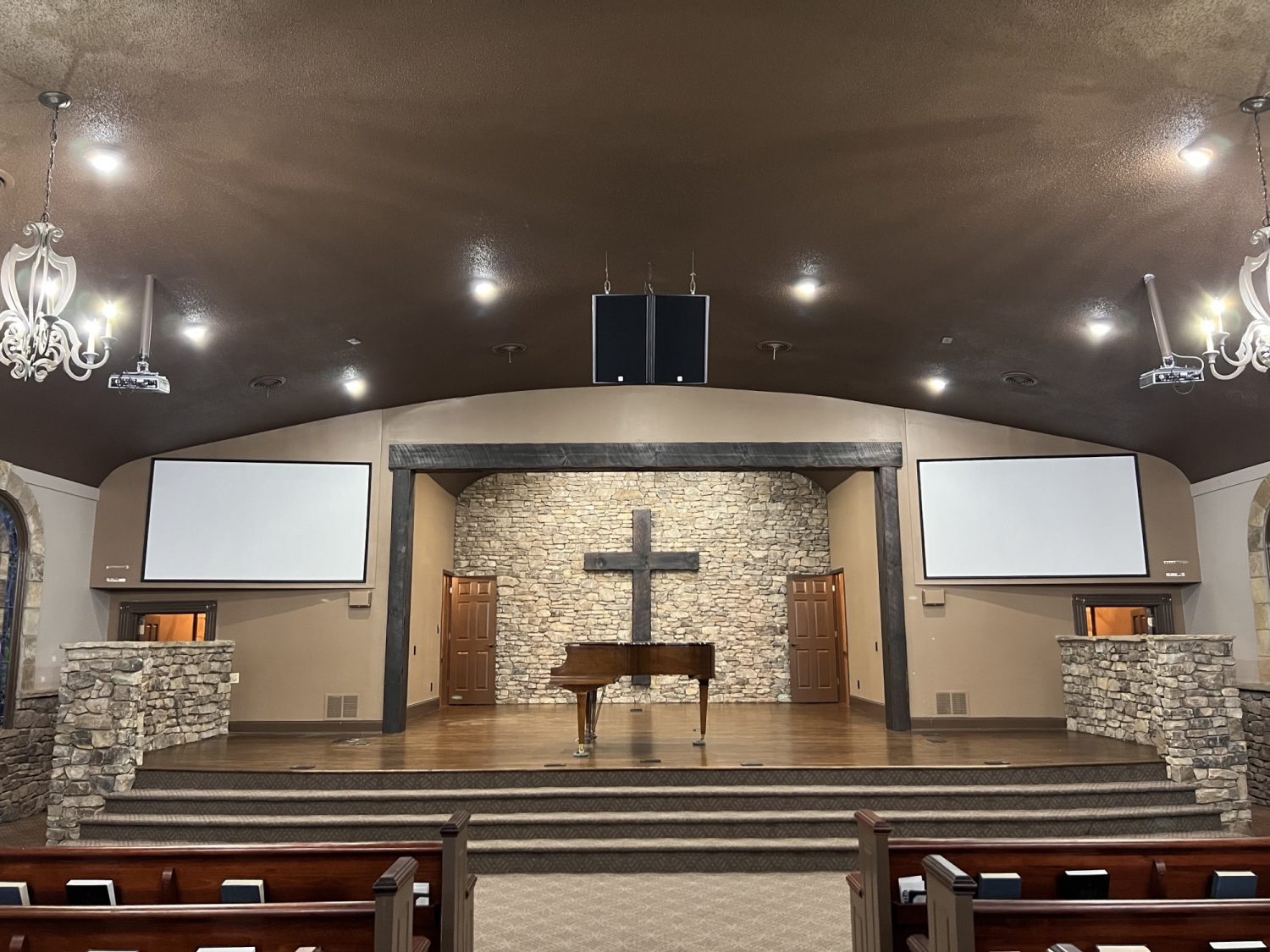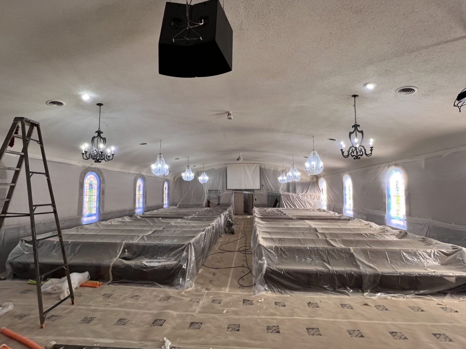 The project involved our crew prepping the church interior for repainting, covering over 50 pews, chandeliers, video and audio equipment, the entire floor of the congregation area, sanding the trim, some drywall repair, applying primer, then painting the interior for this beautifully restored interior.