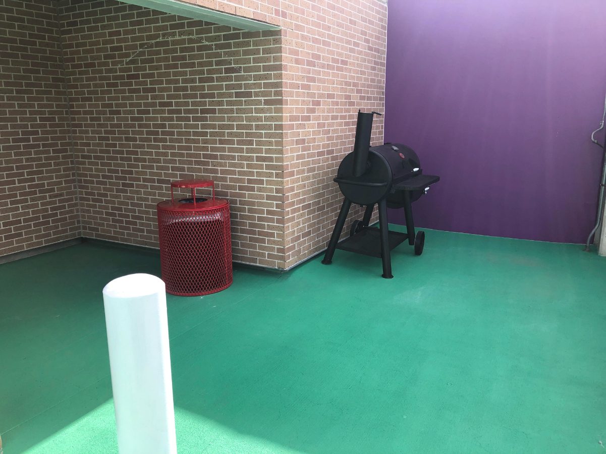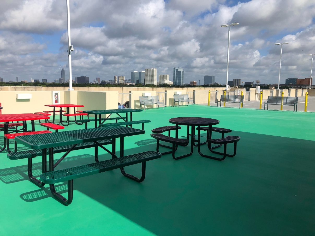 The Assessment Center wanted to create an outdoor hang-out space on the roof of their garage. An artist was brought in to create a decorative wall. The organization asked us to create a rooftop floor that brings color to the area.