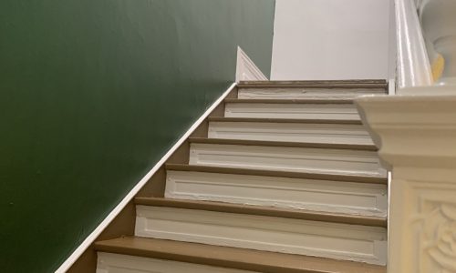 In this photo, you can see where our experts repainted the stairs, hand rails and accent wall. The original red color was especially difficult to repaint.