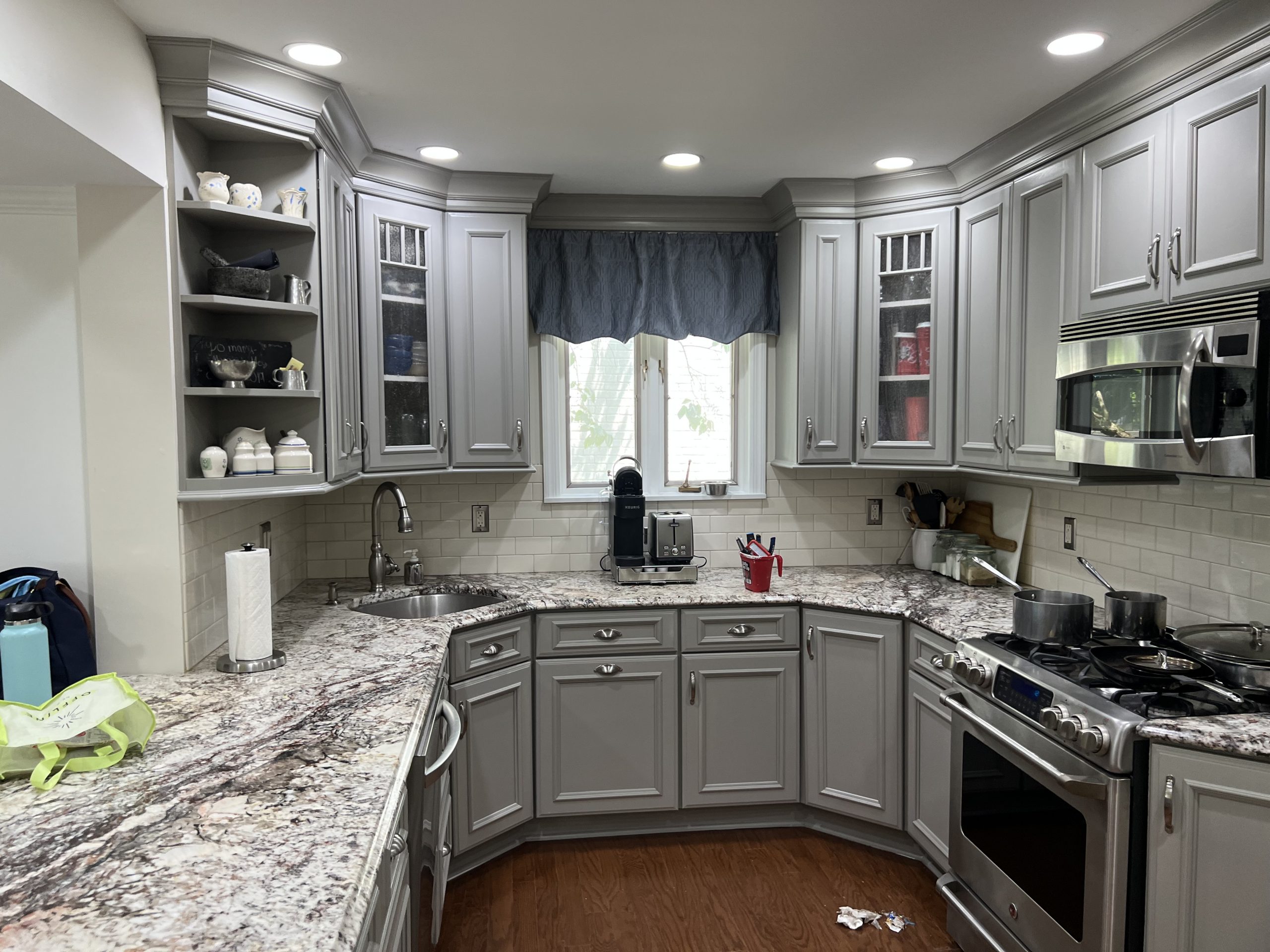 The experts at CertaPro Painters® of Pittsburgh-South Hills, PA, recently updated the cabinets in this customer’s kitchen by changing the dark wood stain to a coat of gray paint.