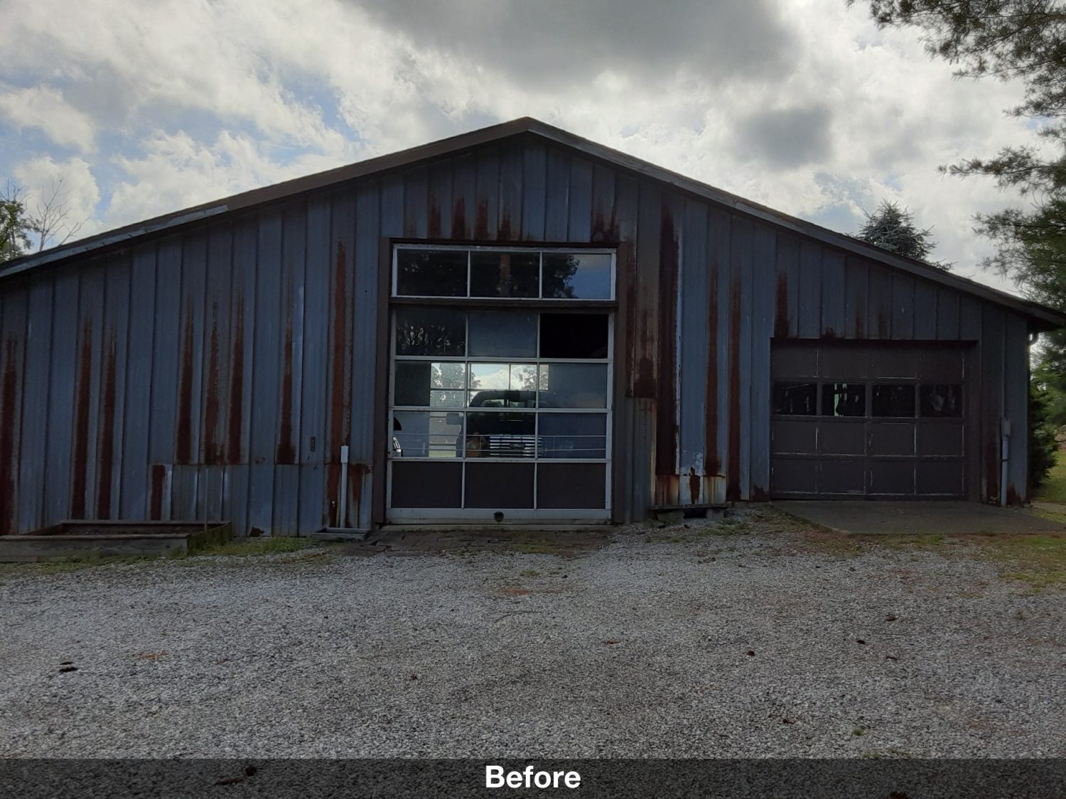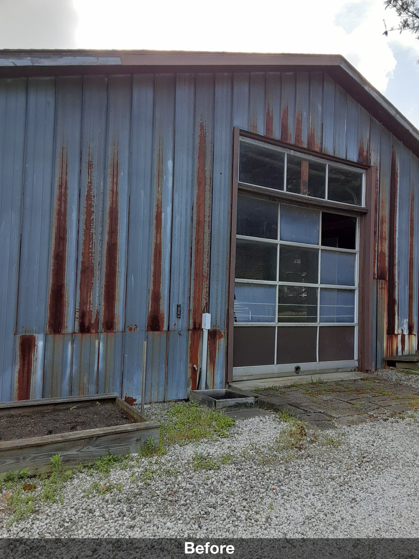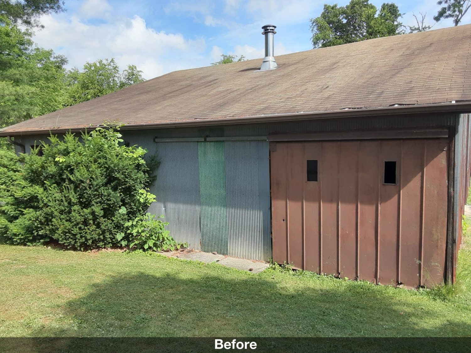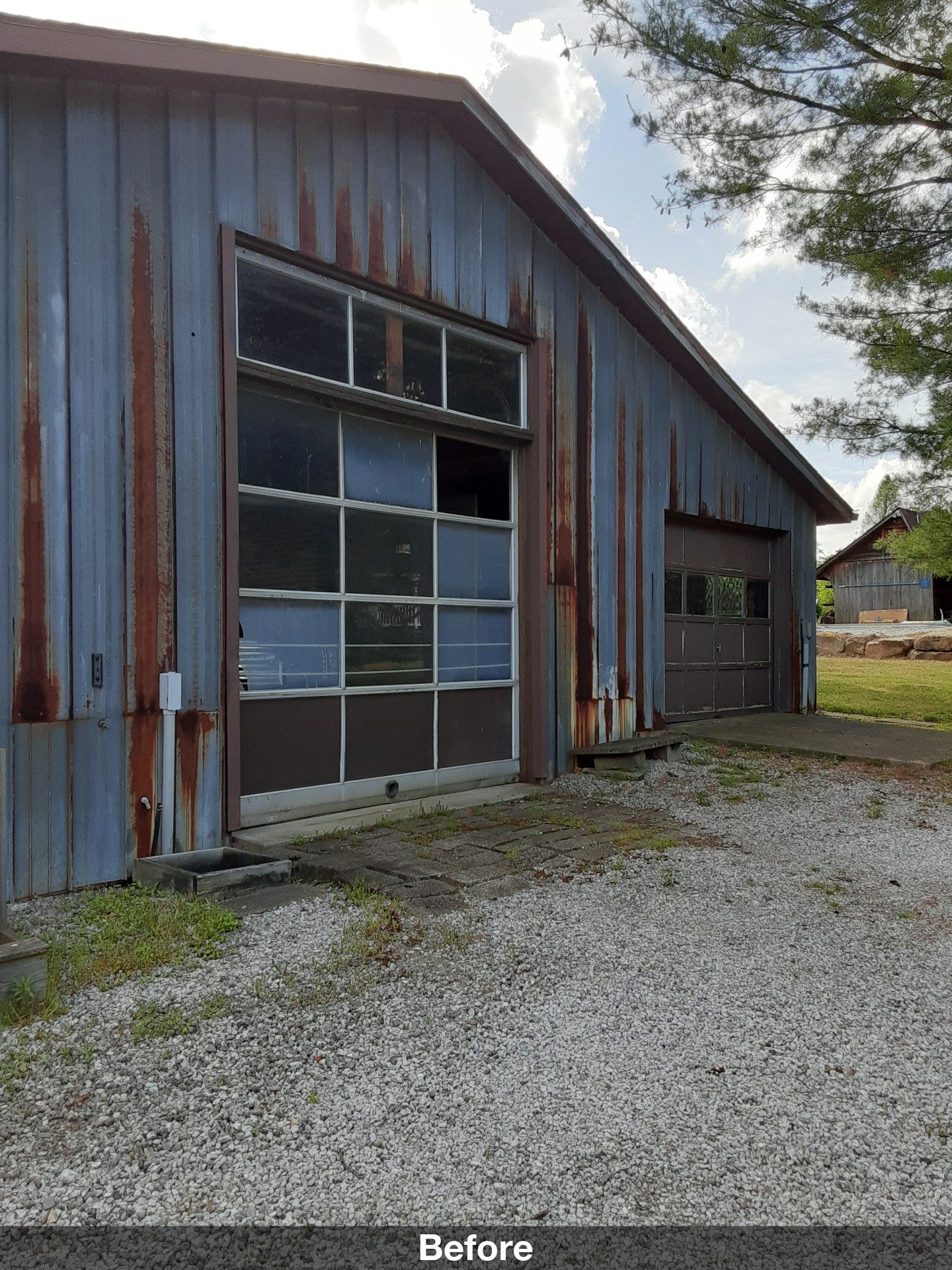 A garage receiving a full restoration by CertaPro Painters® of Pittsburgh - South Hills, PA, including reinforcement with an anti-rust agent. The garage was also painted to match the color of the home, creating a wonderful combination of properties!