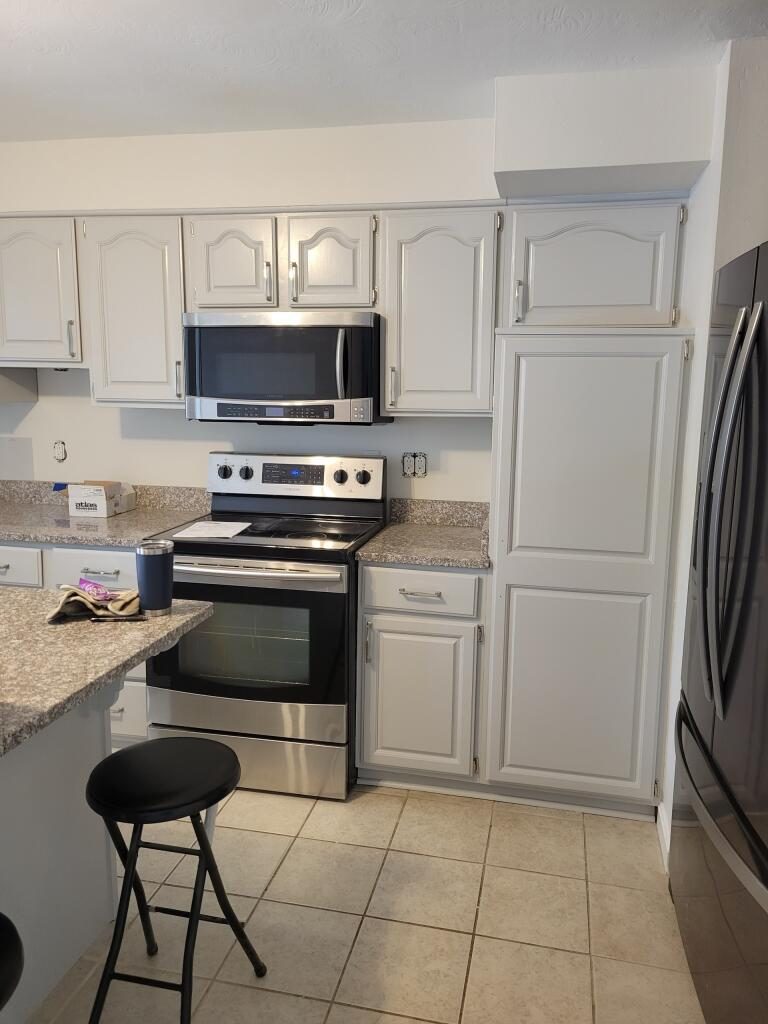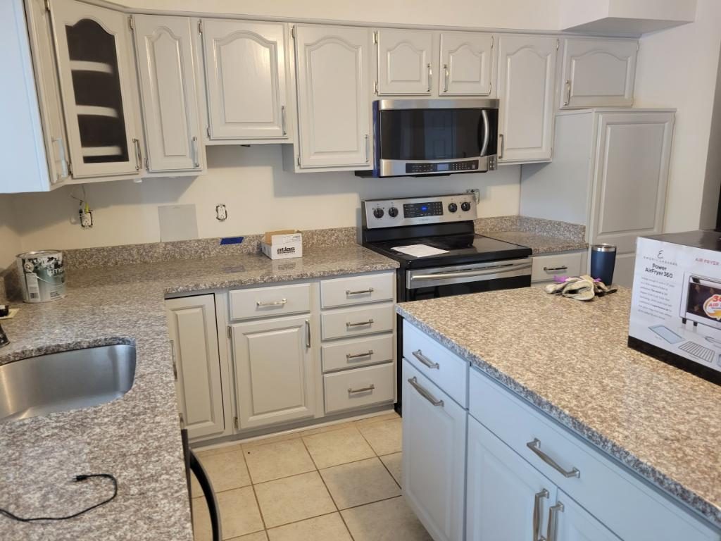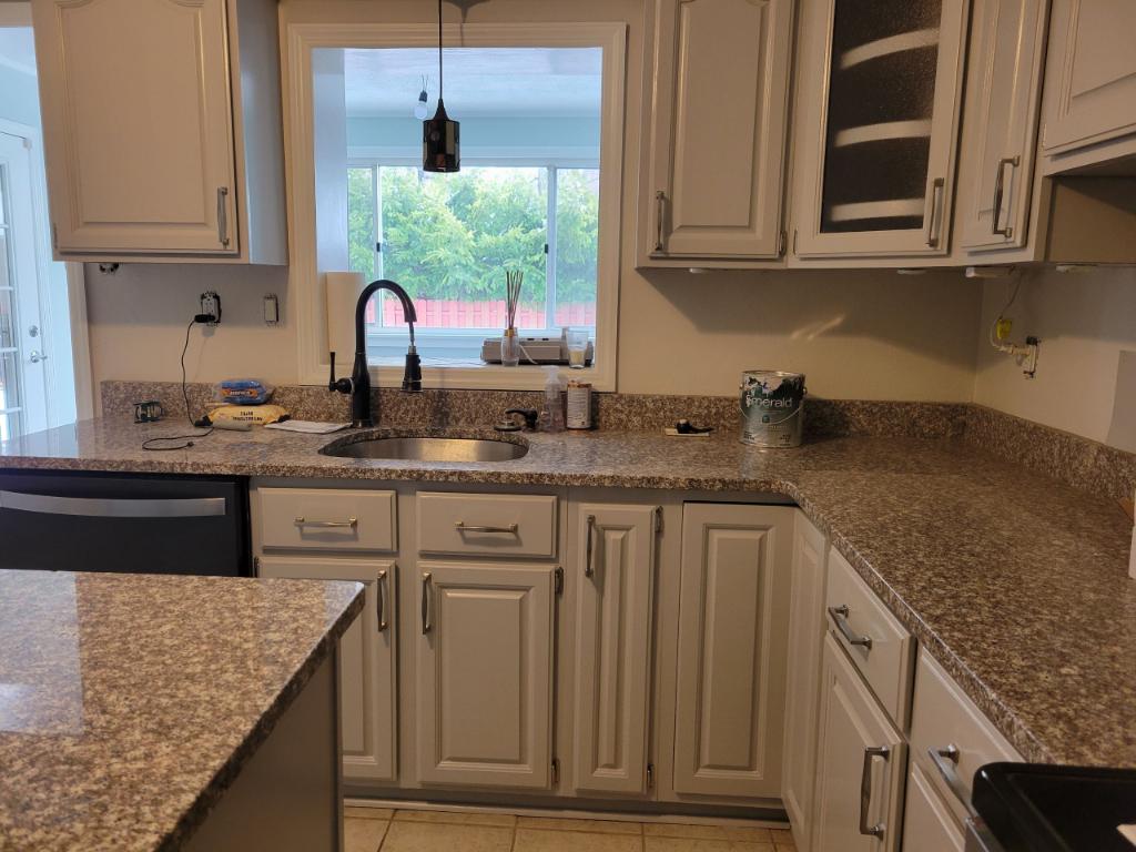This kitchen had its cabinets refinished from a dull dark brown to a modern and bright white for far less than the cost of replacing the cabinets.