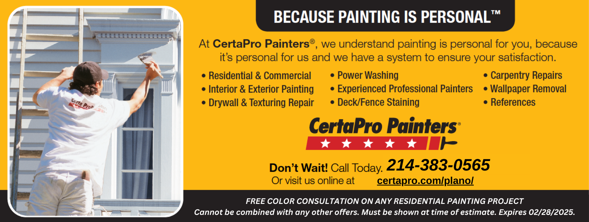 Must provide valid identification to get discount. Inquire at time of estimate. Valid only at CertaPro Painters of Plano, TX.