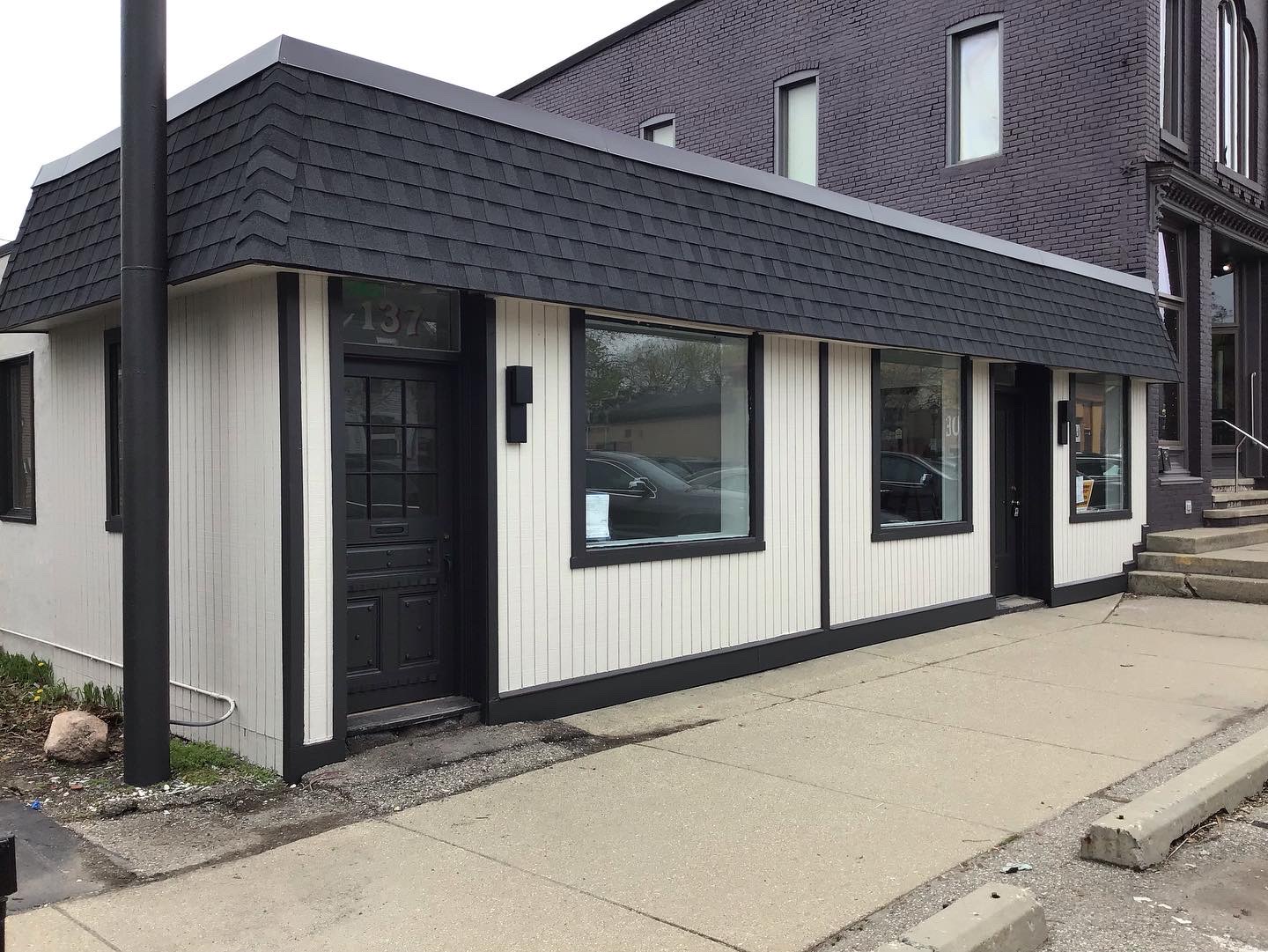 Commercial transformation of a building in Old Village, Plymouth, MI. Our painters repainted the exterior a white color with black trim.