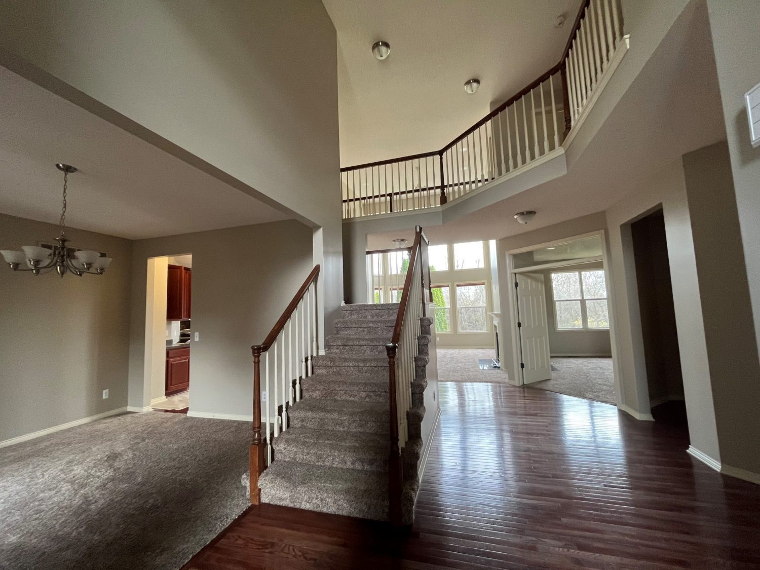 Two-story entry way and great room. Neutral walls, with white trim and spindles.