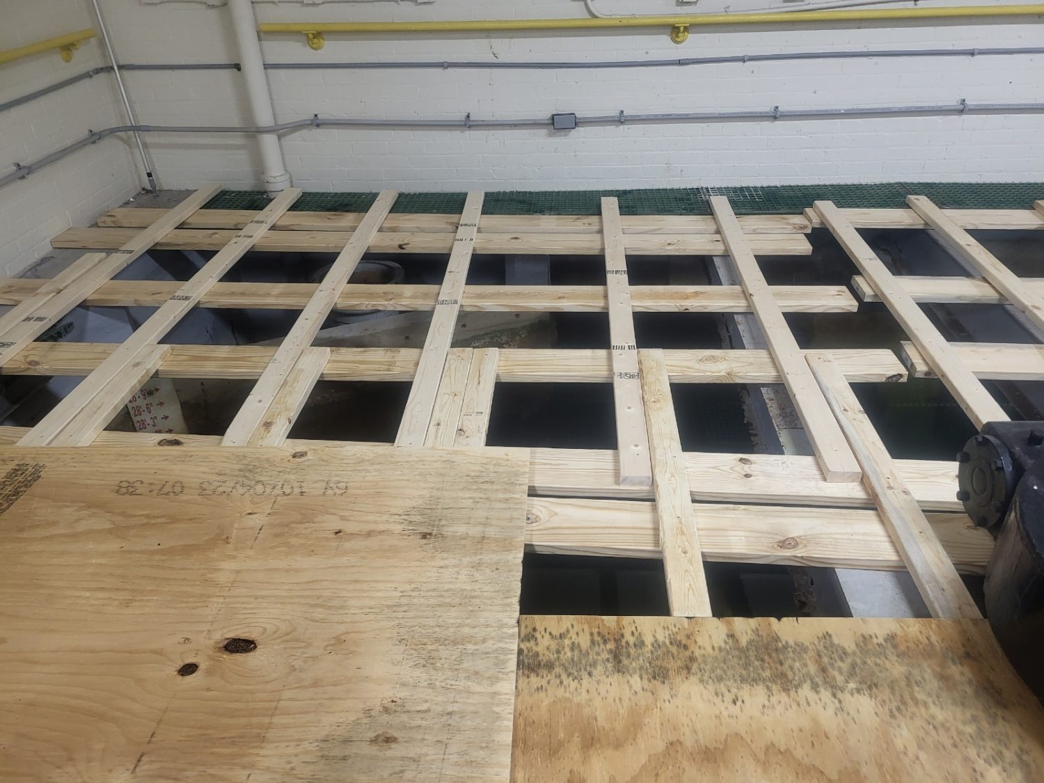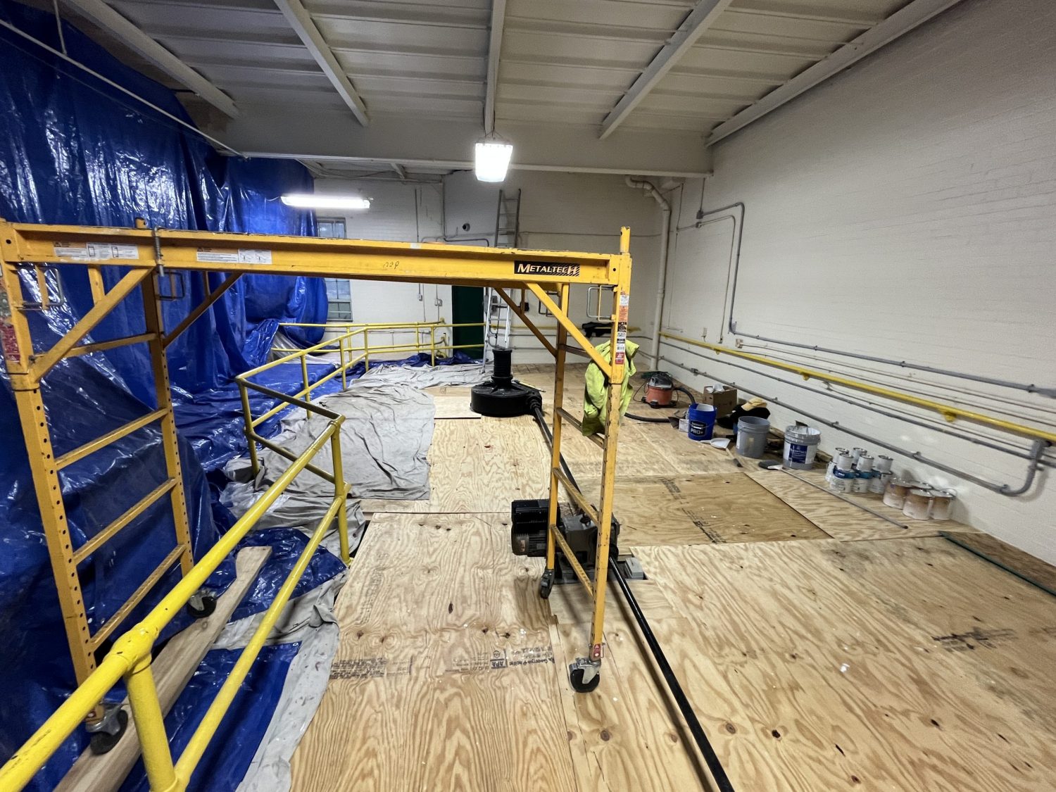 The ceilings above the open water tanks exhibited severe peeling. To address this, we constructed platforms and enclosed the area with tarps while manually scraping before applying paint.