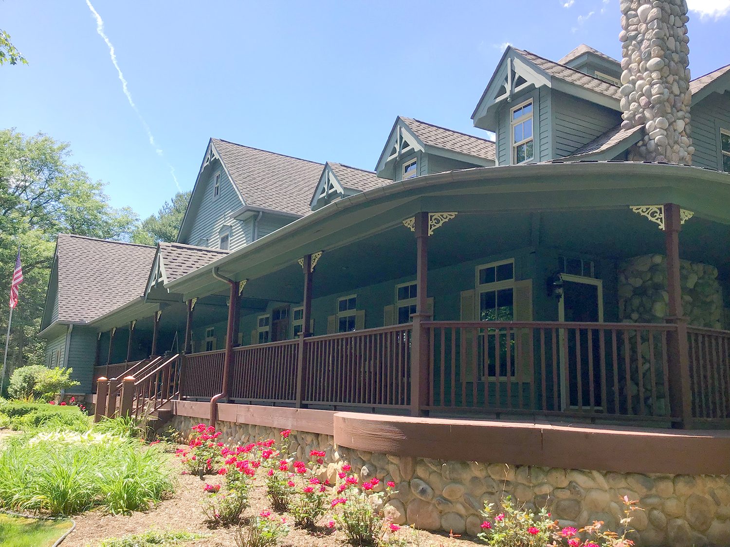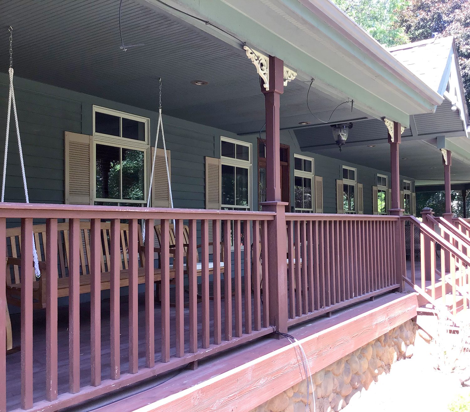 The colors were dated and the previous owner had not maintained the property so that the wood siding was peeling, faded, and damaged. The large wrap-around front porch and back deck were also in poor shape and in need of repair and painting. Extensive carpentry work was required from the lack of maintenance in some hard-to-reach areas.