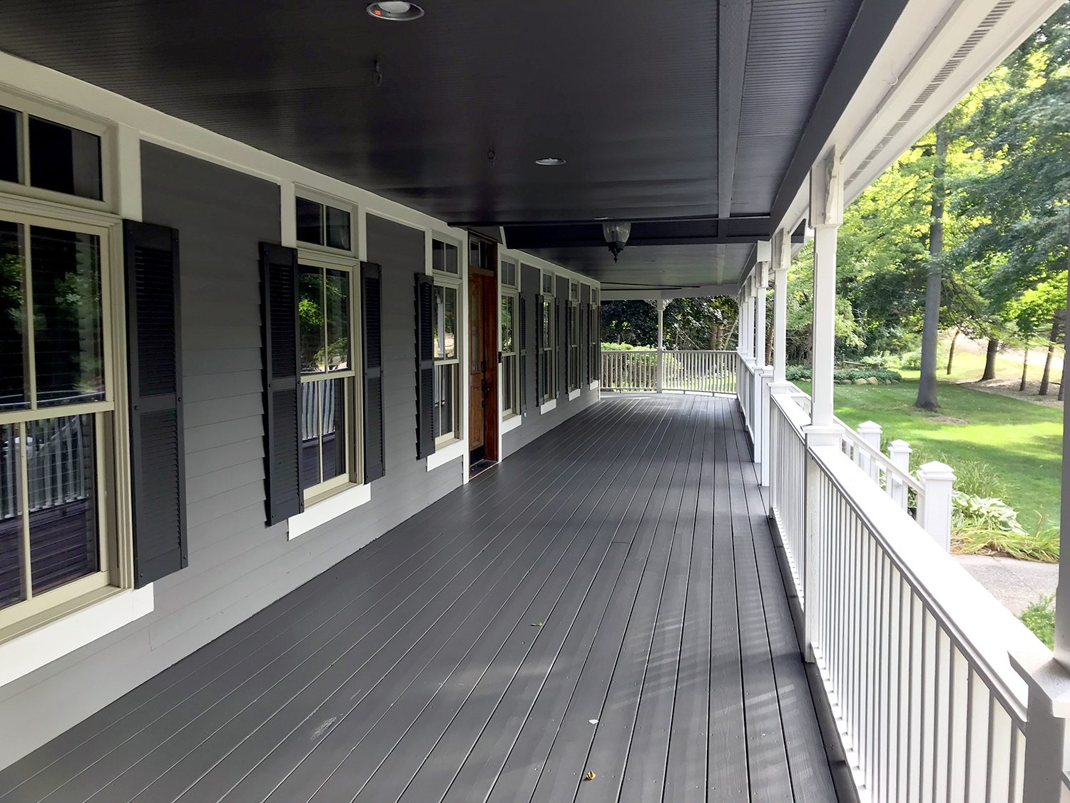 The south side of the home was so significantly damaged by the sun that we found even 4 coats would not adequately cover. We put in a special order for a product (Resilience by Sherwin Williams) that has a much higher build in coverage and would create a more uniform look when sprayed on the siding. This saved the customer from having to fully reside the damaged areas and gave the old siding new life. We also pivoted mid-project on what we used on the porch and deck door, switching from a stain to the Porch and Floor Enamel product as a more durable solution in this case.