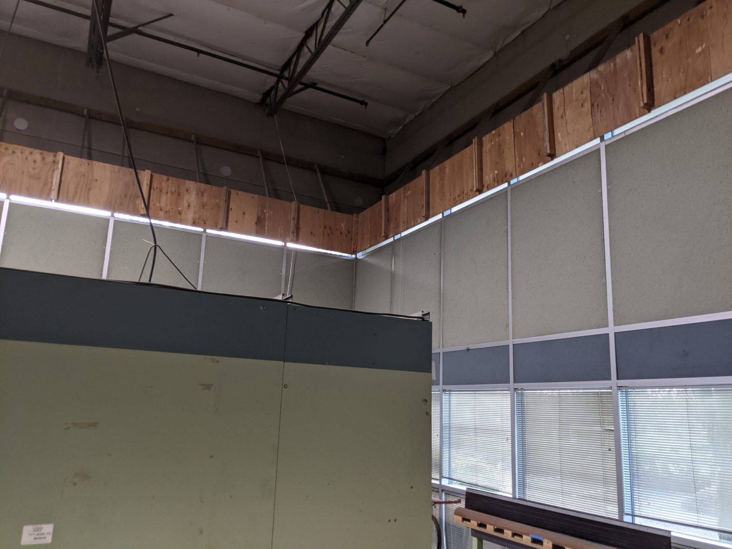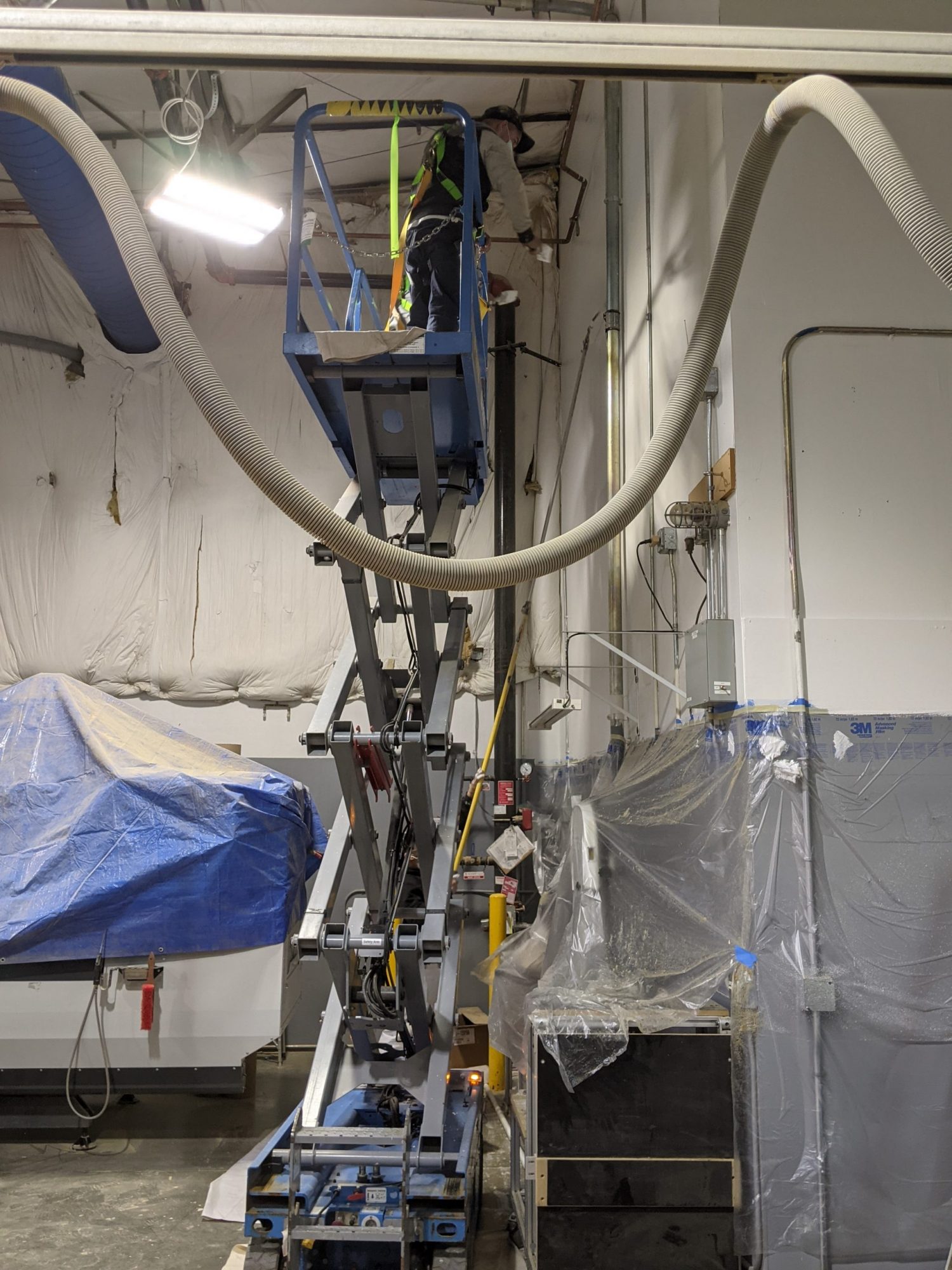 The client initially painted the bottom seven feet of their walls gray and wanted us to handle the walls’ upper portion. Typically, we would spray walls of this size, but that wasn’t possible due to the valuable equipment in the space and the amount of dust it would generate. Although the warehouse’s drywall was in good condition, a water leak resulted in staining on some of the concrete tilt-up walls, so we had to take care of that as well.