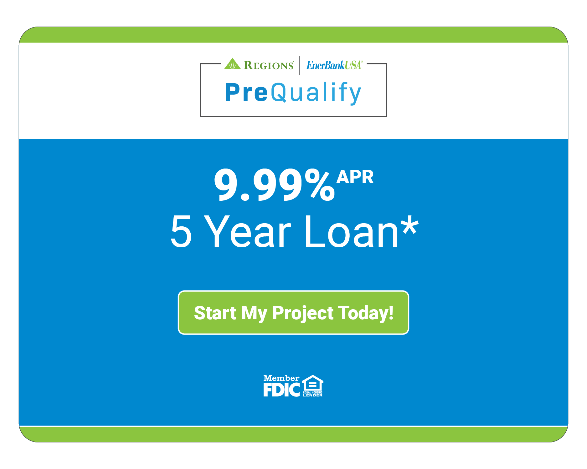 Terms: Credit and loans provided by Regions Bank d/b/a EnerBank USA, Member FDIC, (650 S Main St, Suite 1000, Salt Lake City, UT 84101) on approved credit, for a limited time. 9.99% fixed APR, subject to change. Minimum loan amounts apply. Interest starts accruing when funds are disbursed. Open line period payments due 90 days after origination and monthly thereafter during the open line period. When the open line period ends, the balance becomes a fixed rate installment loan; the repayment term is 60 months. Actual loan term may be shorter if less than the full approved amount of credit is used. The first monthly loan payment is due 30 days from the end of the open line period. 60 monthly payments of $21.24 per $1,000 borrowed. The minimum monthly payment will be no less than $50.00.