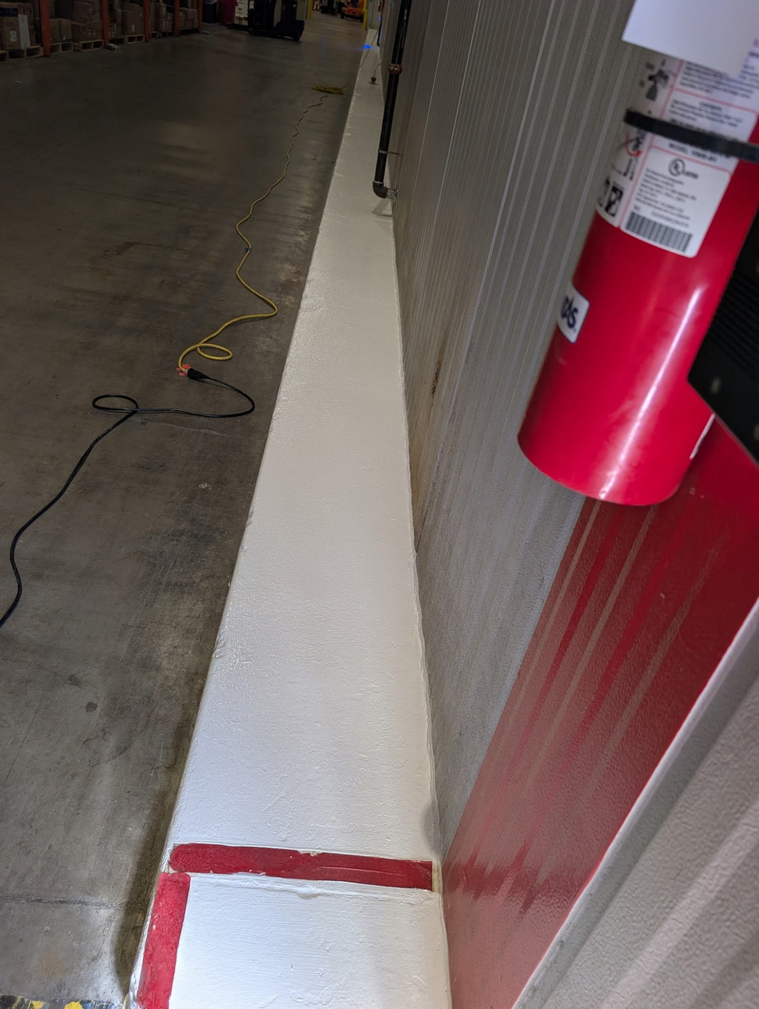 The project involved repainting approximately 600 linear feet of rat run lines, which had not been maintained since the facility was built. The existing paint was dull, peeling, and in many areas completely worn away from years of heavy use. To ensure long-lasting results, we prepped the concrete floors by grinding the surfaces with a diamond plate sander and carefully taping the perimeter for clean, crisp edges. We then applied a Sherwin-Williams two-part epoxy system in white, designed for durability and resistance to the constant wear of a high-traffic warehouse environment.