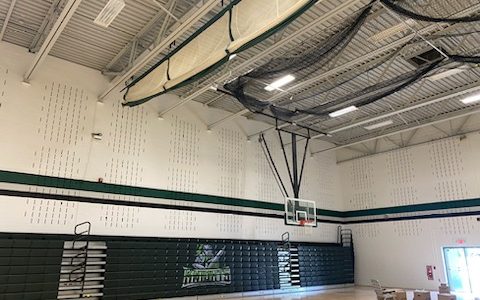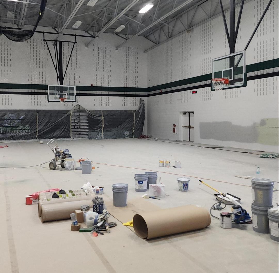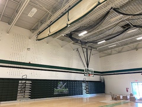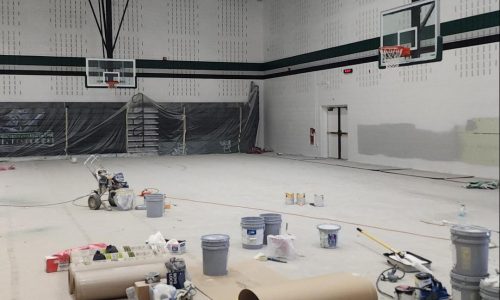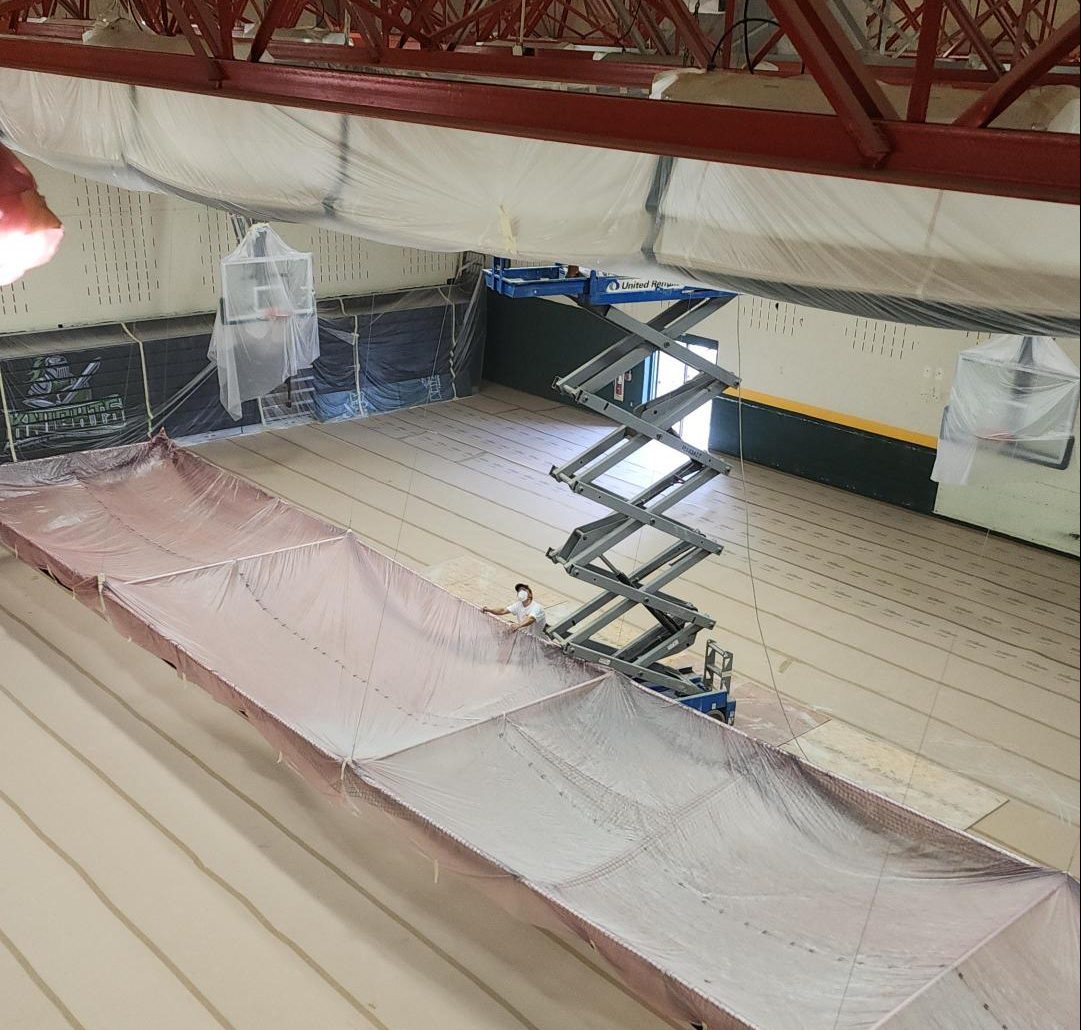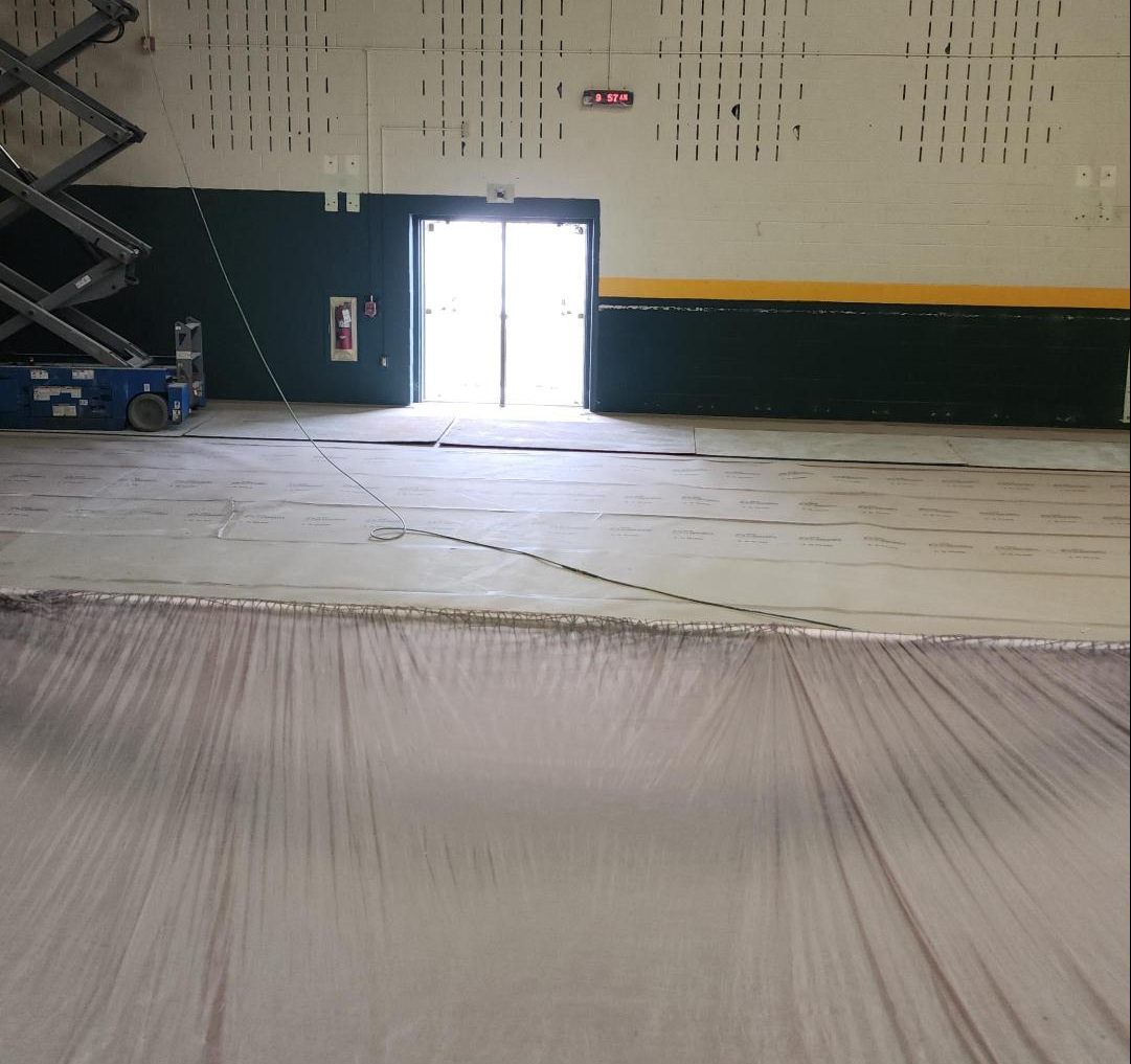 Two 32′ scissor lifts were required for the project. To protect the floor, we used Trimaco FloorShell for full coverage and placed large plywood boards to distribute the lifts’ weight, preventing any damage. Extensive covering was necessary for ceiling items (vents, lights, ducts, lines, speakers, basketball nets, hanging floor mats and netting) and block walls (bleacher sets, doors, scoreboards, fire apparatus) using plastic.