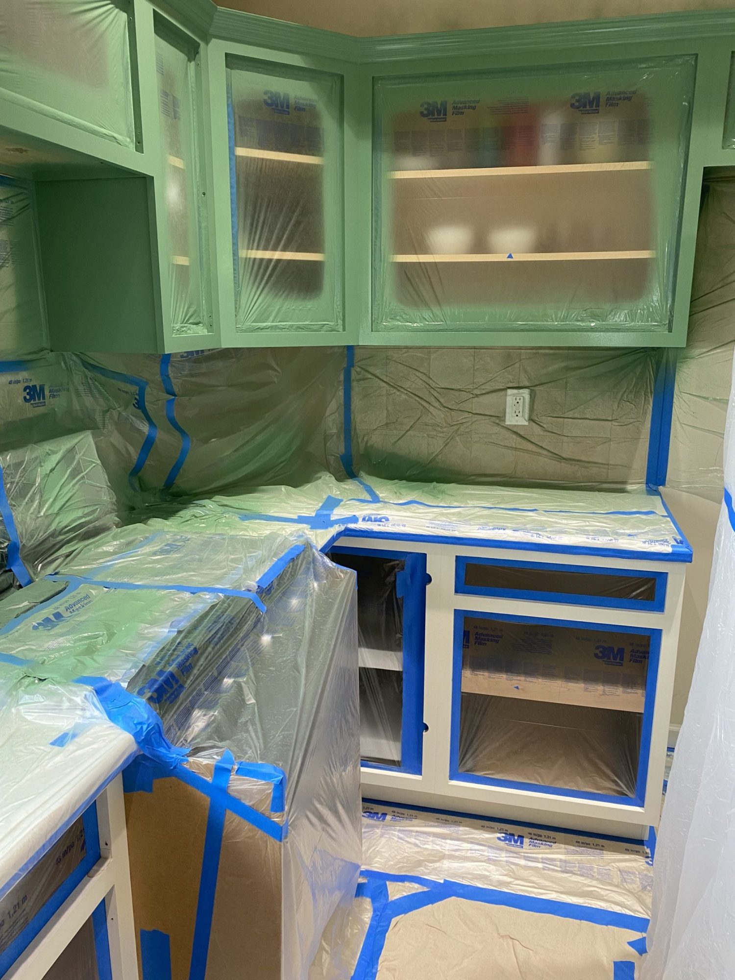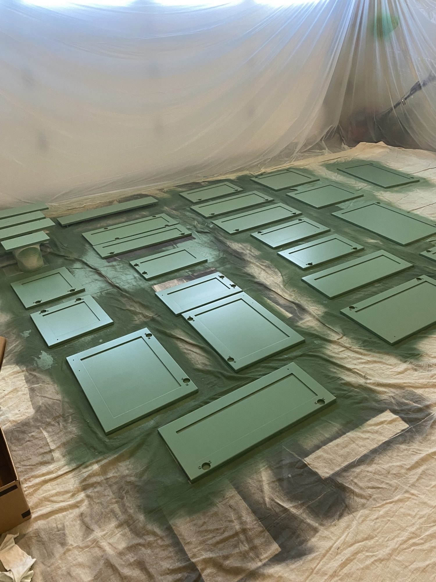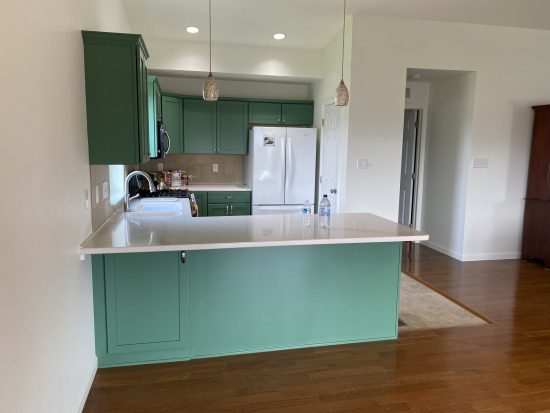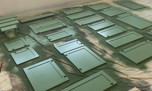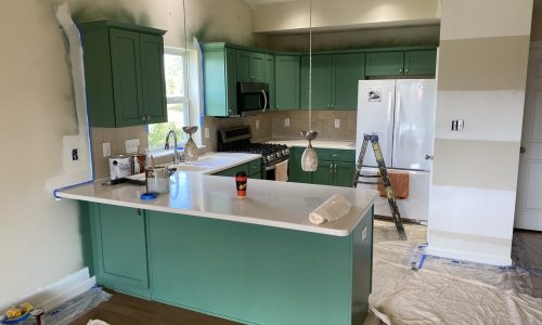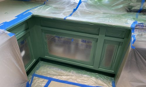 To meet the customer’s desired quality and appearance for the cabinets, we covered all surfaces in the kitchen and established a designated “safe to spray area” within it.After carefully removing the doors and covering every inch of the kitchen, extensive sanding and priming were undertaken to ensure that the new “Jadite SW6459” color from Sherwin-Williams met the expected level of beauty and shine.