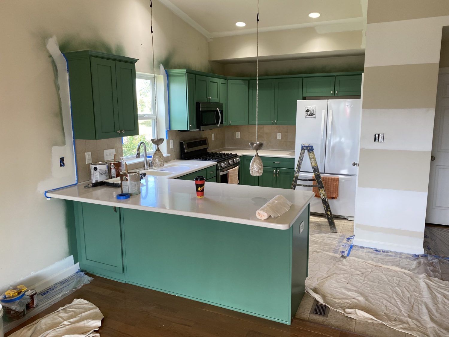 This well-maintained home, in our care since its 2013 construction, needed a refresh after a decade of use. We focused on the kitchen, cabinets, and family room. First, we repaired the entry ceiling and removed cabinet hardware and doors for refinishing. To meet the customer’s high standards, we covered the entire kitchen for a safe spray area. After extensive sanding and priming, we achieved the desired brilliance with Sherwin-Williams’ “Jadite SW6459” color, exceeding expectations.