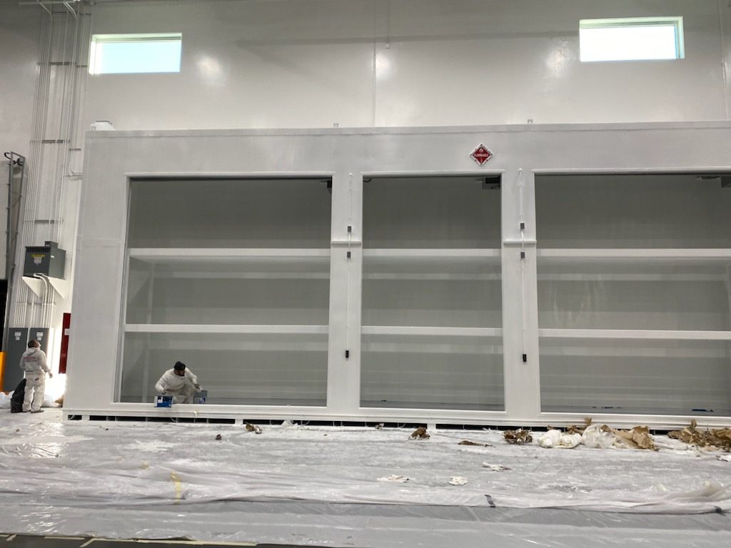 By sectioning off the area from the ceiling down to the floors in plastic sheeting, taping off the fire protection equipment, signage, roll-up doors, and electrical boxes, they were able to paint the entire structure neatly and in a contained manner.